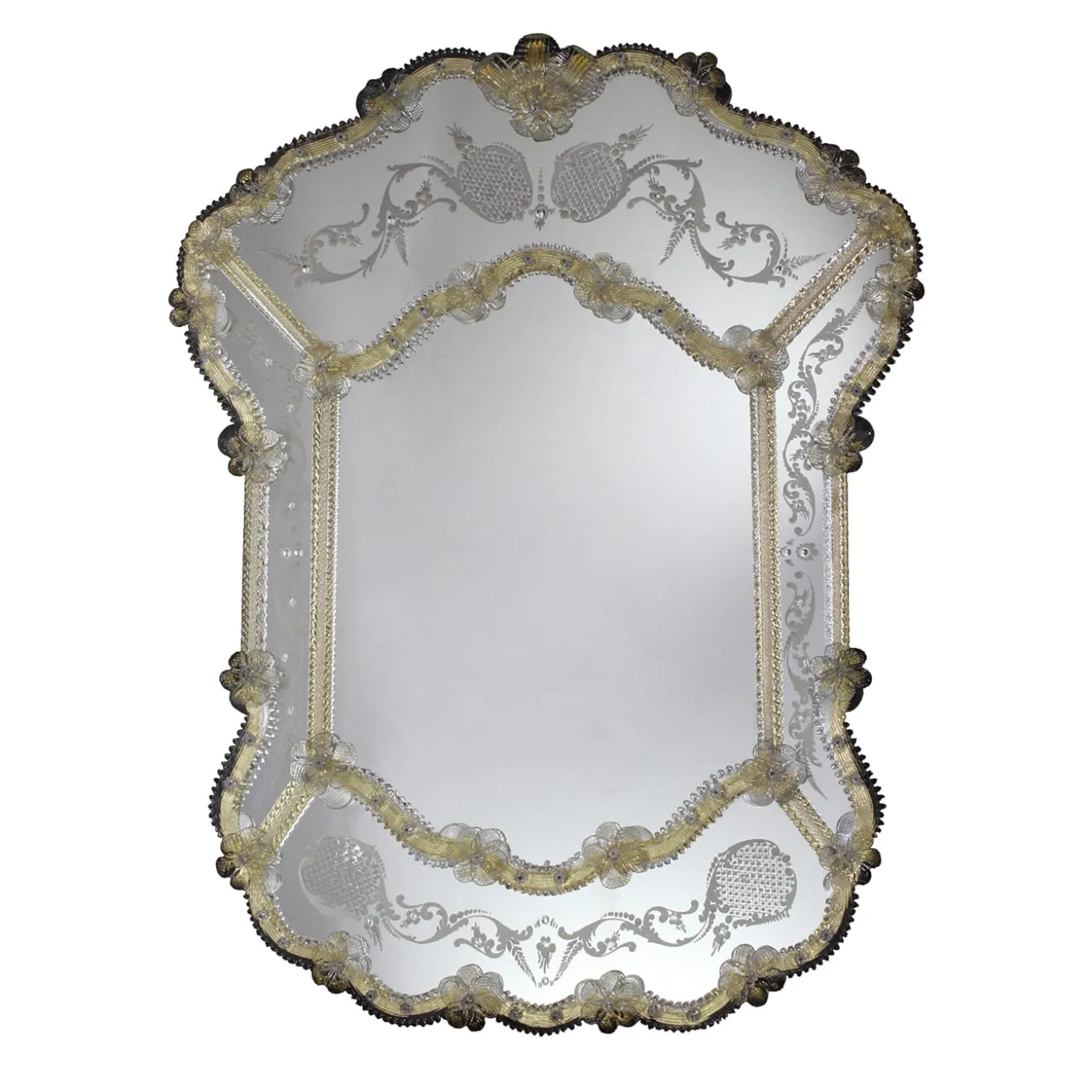 Specchio veneziano realizzato nella più rigorosa tradizione muranese con uno stemma e una ricca cornice accuratamente incisi a mano. Il tutto assemblato con elementi in cristallo/oro realizzati a mano nelle fornaci di Murano. Cornice in legno con finitura naturale. Chiedere al Concierge per i dettagli.