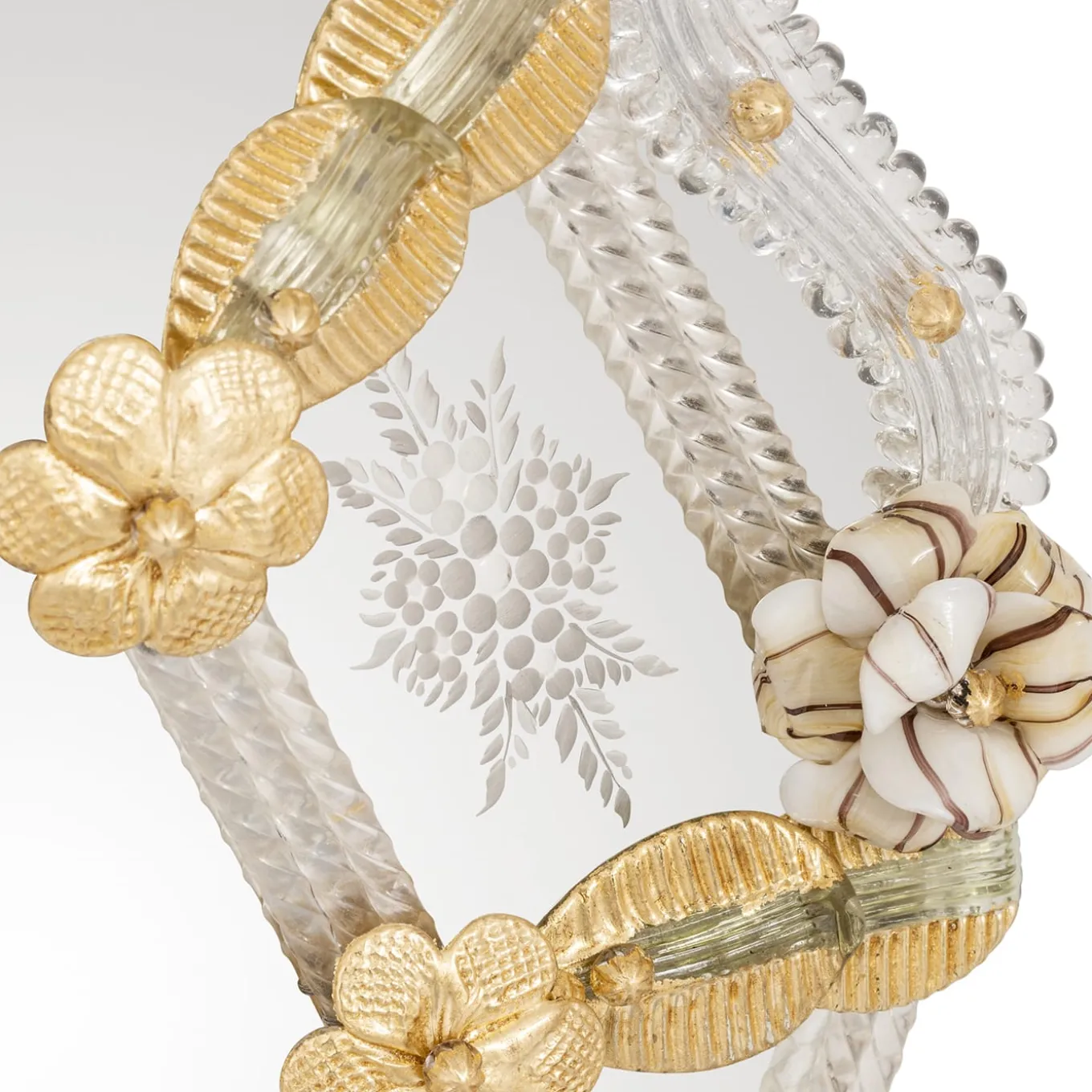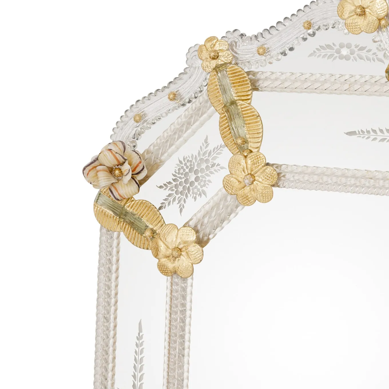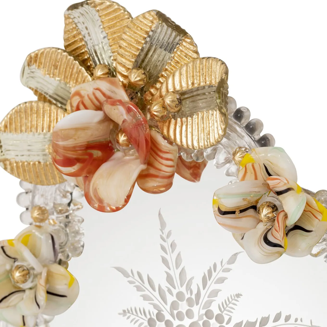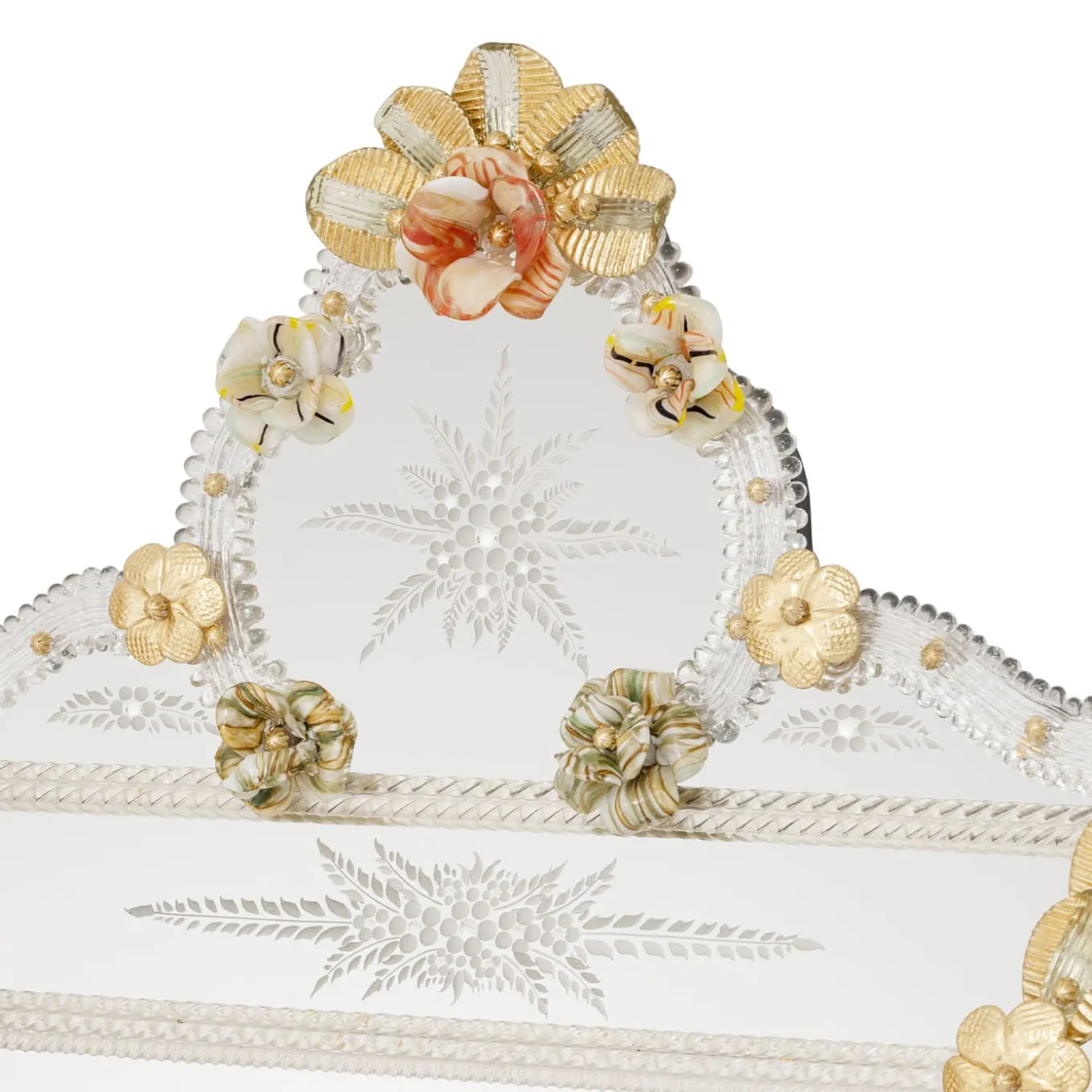 Opulenza e romanticismo si fondono in questo superbo specchio. Uno spettacolo sia per gli arredamenti contemporanei che per quelli classici, vanta graziose incisioni floreali eseguite a mano da maestri artigiani e ornate da rose dorate, fiori policromi e foglie in una lussuosa combinazione di onice e oro.