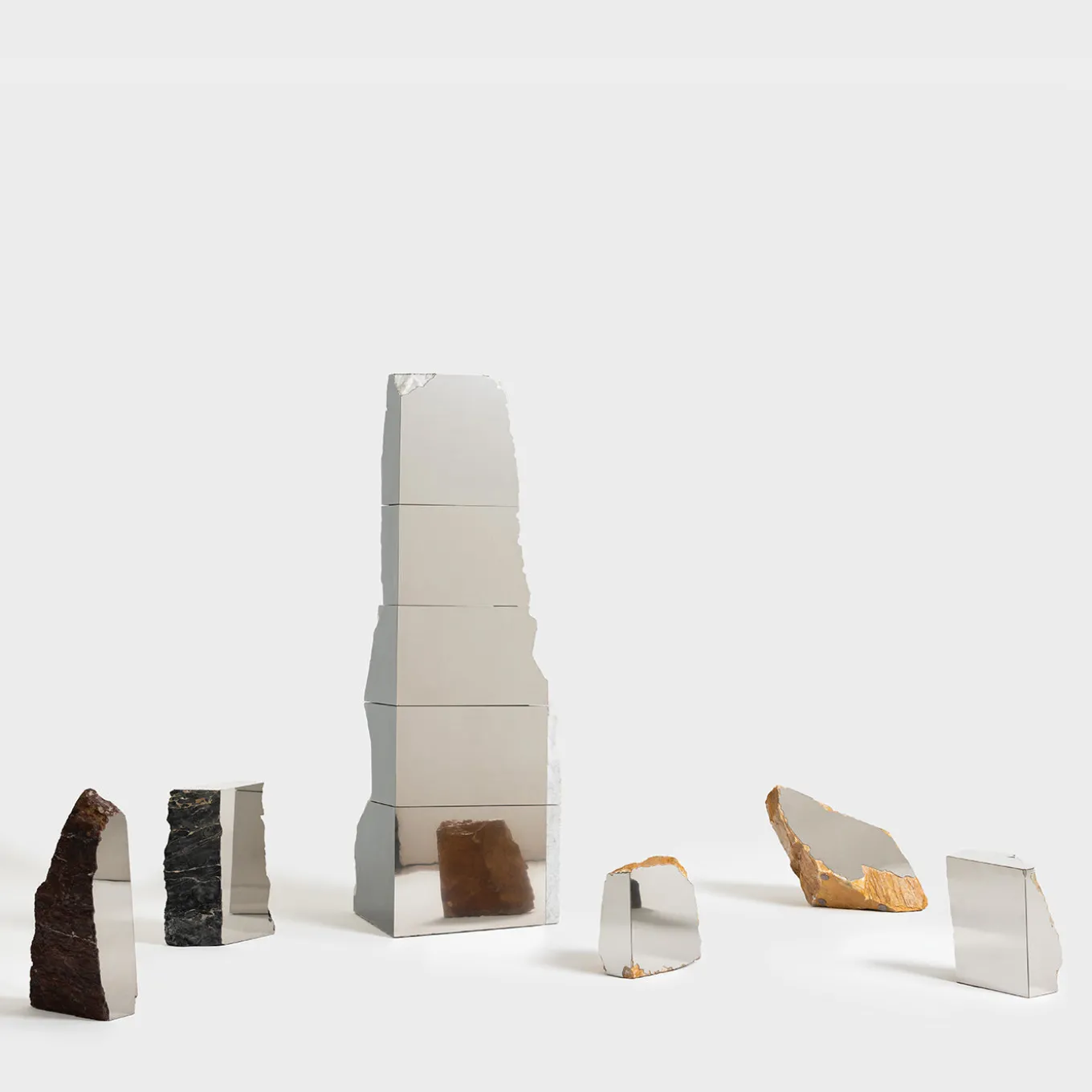 Questo specchio, parte della collezione Immersione di Duccio Maria Gambi, unisce la pietra naturale grezza all’acciaio lucidato a specchio, creando un sorprendente dialogo tra materia e luce. Realizzato a partire da un unico blocco di marmo di scarto, il pezzo conserva la forma organica della pietra, mentre il lato piatto in acciaio riflettente sembra dissolverne la massa, fondendo il solido con lo spazio circostante. Un oggetto che trasforma la materia in esperienza visiva, giocando con riflessi, contrasti e percezioni dinamiche dello spazio.