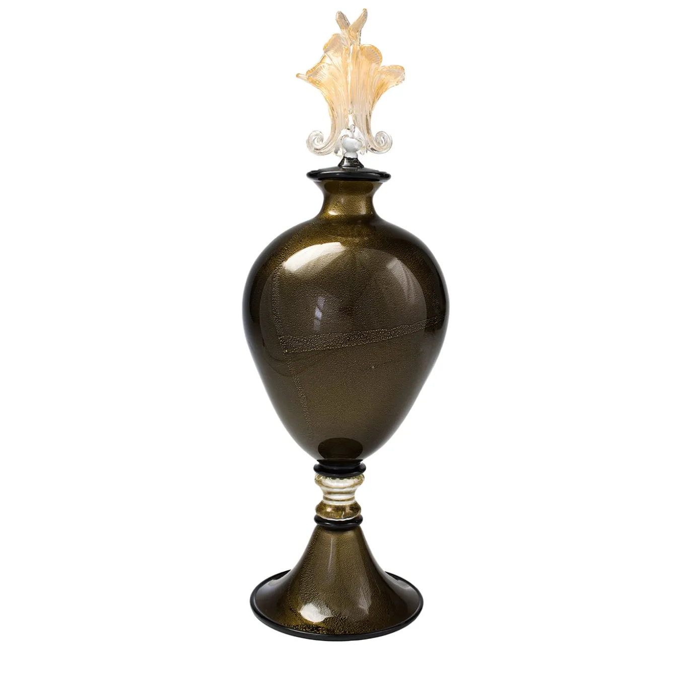 Un rinomato maestro vetraio muranese soffia a bocca e rifinisce manualmente questo vaso con piede, unico nel suo genere, utilizzando tecniche antiche che ne esaltano lo splendore classico. Sormontato da un coperchio scultoreo in cui sono accoppiati boccioli di fiori, il sinuoso corpo nero poggia su una base a tromba che condivide con esso la stessa opulenta aggiunta di grani d’oro 24 carati. Il certificato di autenticità è incluso nell’acquisto.