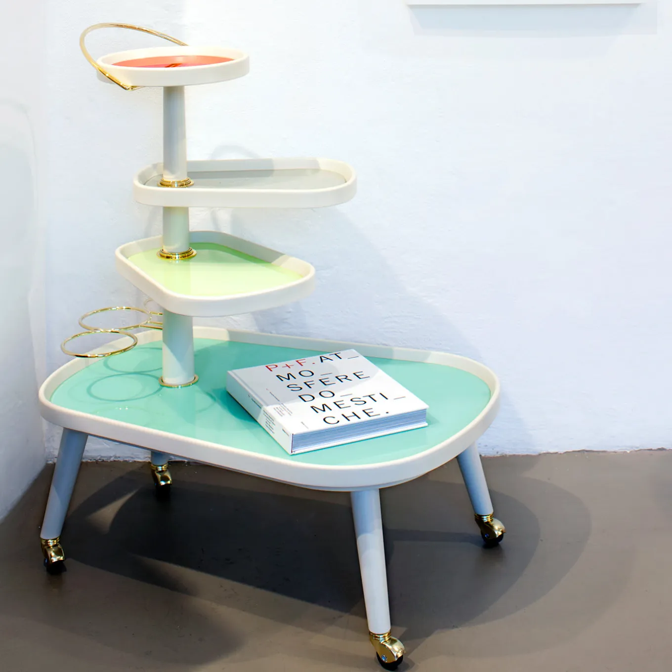 Questo meraviglioso carretto girevole per sushi si ispira alla cultura e alla tradizione giapponese, ma mantiene un’impronta contemporanea. Il carrello è strutturato in fibra a media densità laccata bianca. Gli squisiti ripiani sono disponibili in quattro diversi colori di vetro laccato e in rovere naturale. Le delicate ruote e il portabottiglie sono realizzati in metallo con finitura dorata.