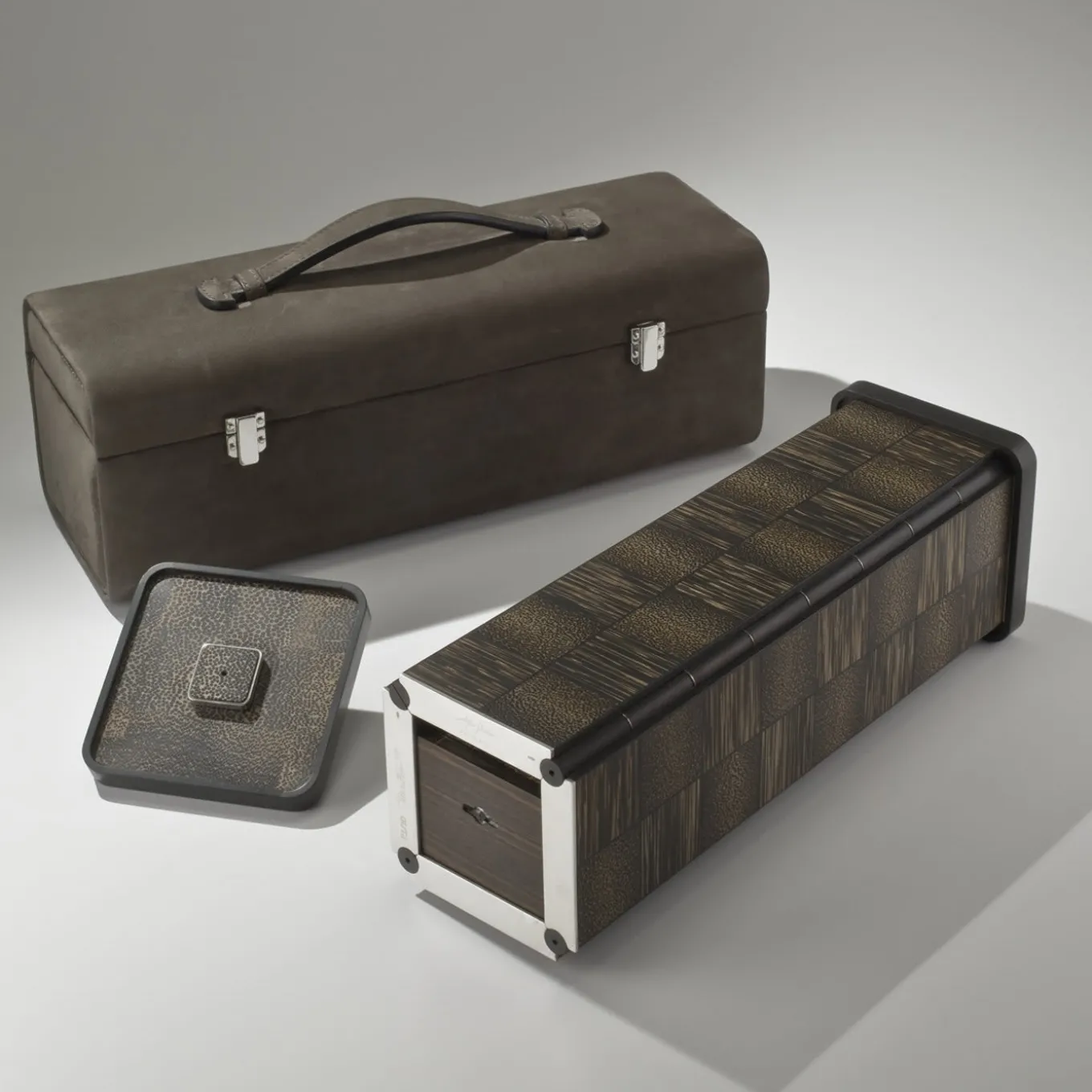 Questa scacchiera in legno presenta un bordo rivestito in legno d’ebano e argento. La parte superiore è pieghevole e diventa una scatola che contiene i pezzi. Lo strato superiore di ogni pezzo è ricoperto di argento inciso con simboli. L’astuccio in cui è riposta la scacchiera è in pelle nabuk.
