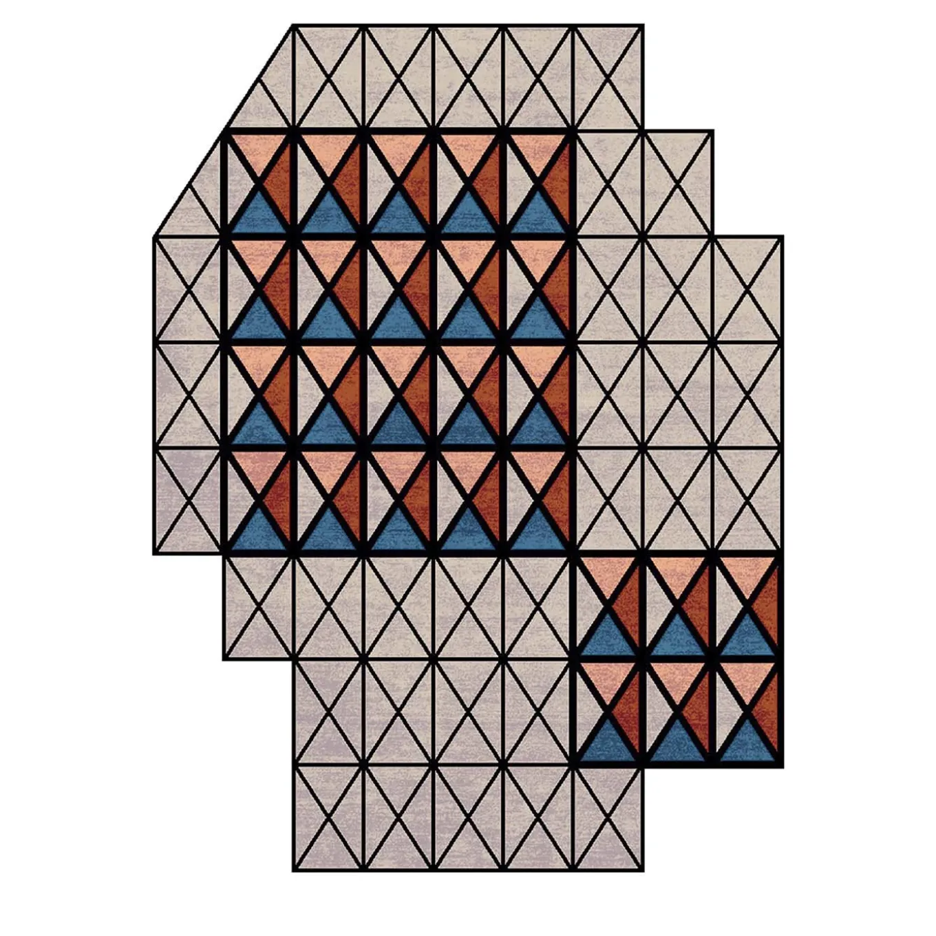 Questo splendido tappeto dalle forme geometriche uniche aggiungerà un tocco di colore e stile a qualsiasi pavimento di casa o ufficio. Questo tappeto in lana e viscosa è annodato a mano in una moltitudine di forme rettangolari e a rombi nei colori beige, blu scuro, rosa e bordeaux.