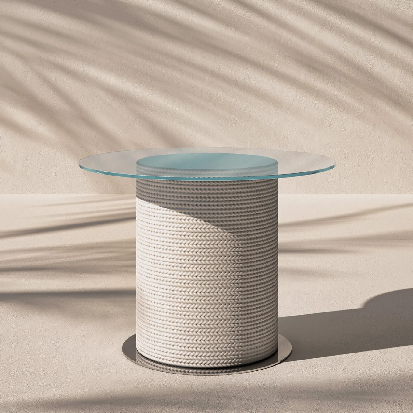 Un pezzo che riecheggia un raffinato stile nautico, questo tavolo rotondo è un esercizio di linee geometriche che eleverà qualsiasi terrazza moderna, patio o zona piscina, offrendo una soluzione per pranzare o prendere un aperitivo in tutta tranquillità. Il piano circolare in vetro extrachiaro è parzialmente retroverniciato e poggia su un’audace colonna rivestita in PLA (poliuretano) bianco che scende fino a una base a disco in acciaio inossidabile.