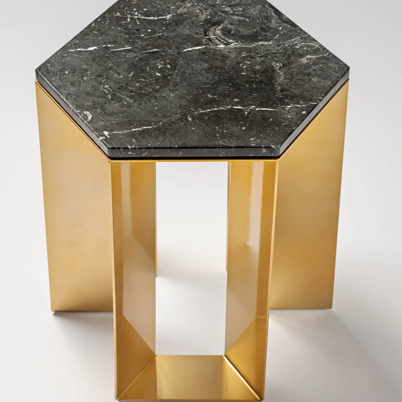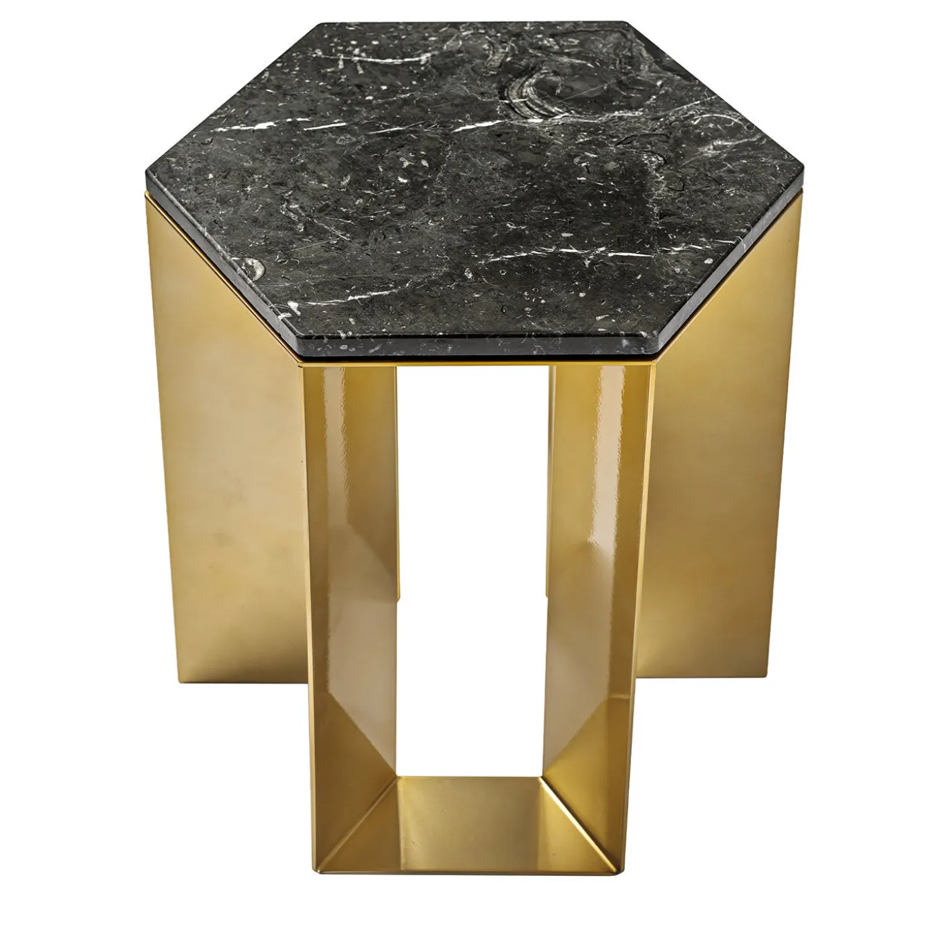 Elegante nel suo design semplice ed equilibrato, questo tavolino appartiene a una raffinata serie creata dall’artista Antonio Saporito per gli interni contemporanei. Pulito ed essenziale, presenta una base in metallo laccato in tonalità dorata composta da gambe leggere e delicate, che sostengono un piano di forma esagonale in marmo nero. Per ulteriori dettagli, consultare il Concierge.