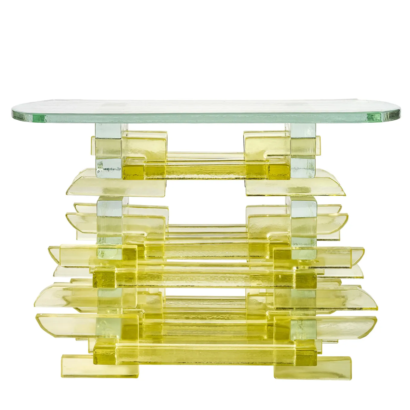 Il tavolino Chain presenta una struttura unica composta da elementi in vetro colato intrecciati tra loro, ispirata alla falegnameria tradizionale asiatica e all’architettura dei templi. Il design prevede l’utilizzo di diversi mattoni a forma di ciambella, tagliati e infilati l’uno nell’altro, creando una base scultorea e ricca di dettagli in ambra chiara, sormontata da una superficie in vetro cristallo testurizzato. Questa edizione numerata mette in risalto la raffinatezza artigianale e l’interazione tra forma e trasparenza.