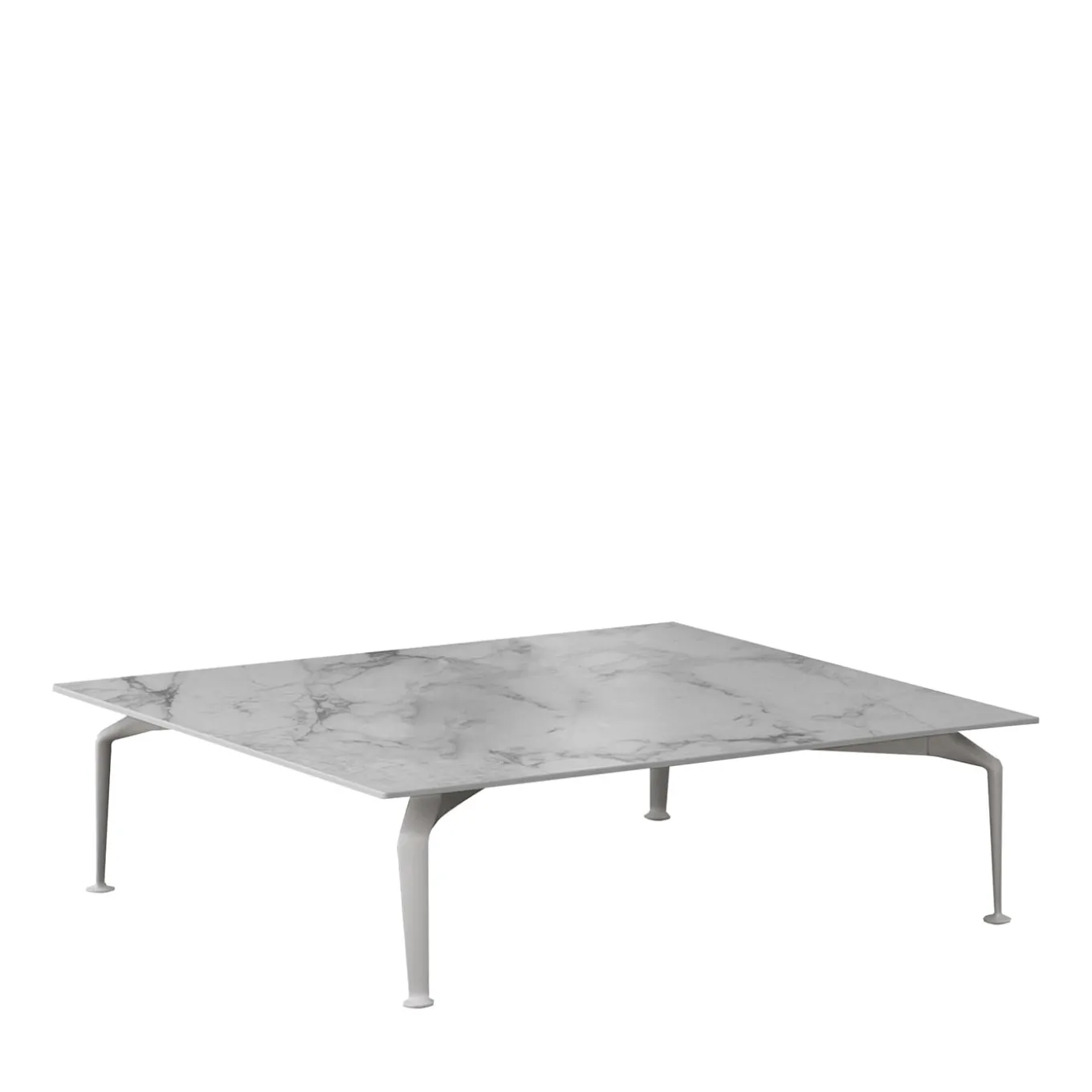 Delineato da un profilo pulito e affilato che conferisce singolarità e raffinatezza al pezzo, questo tavolino ampio e basso è uno splendido progetto di Ludovica e Roberto Palomba. È caratterizzato da una base in alluminio laccato bianco con gambe affusolate che sostengono un piano quadrato in marmo bianco Calacatta di prima qualità.
