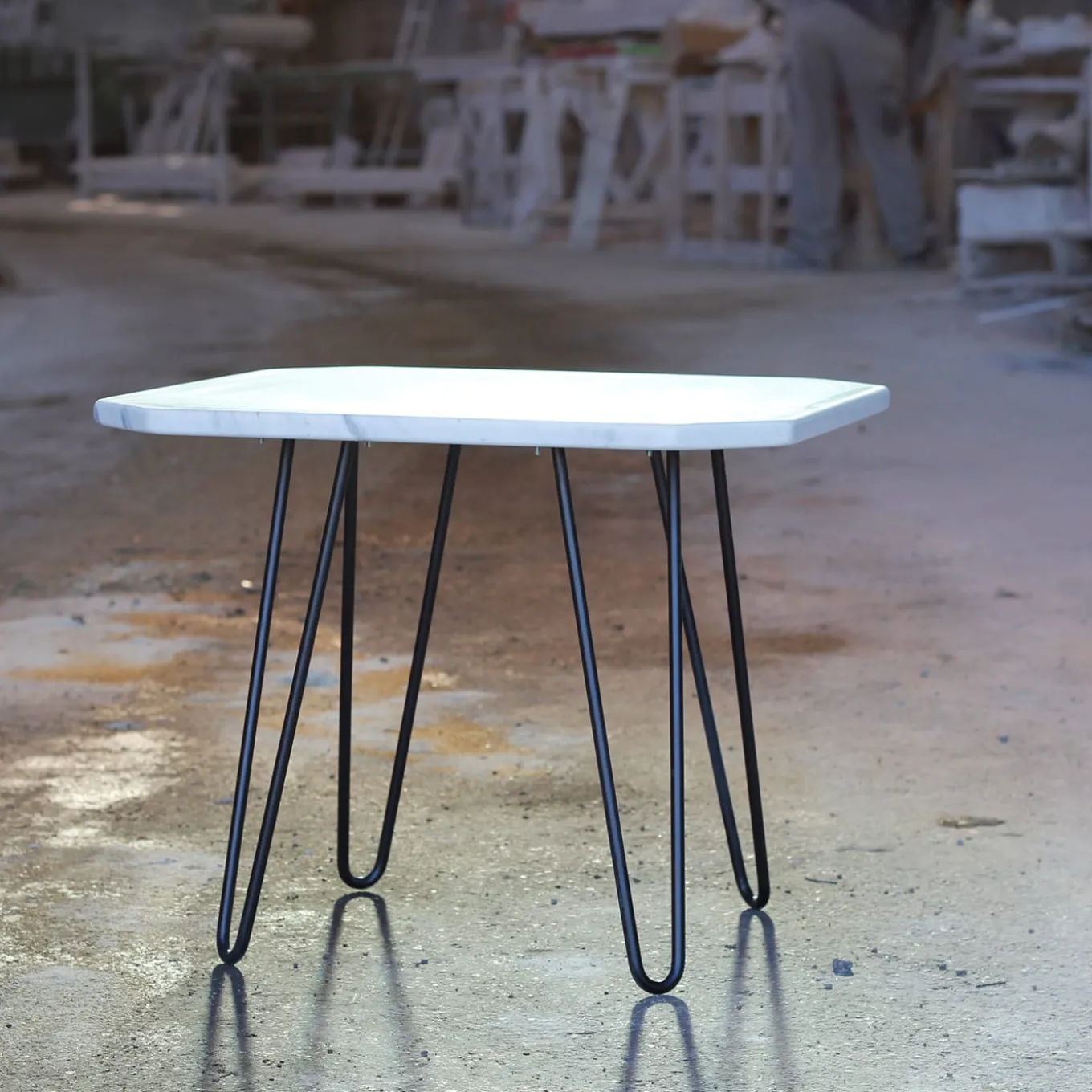 Rivisitazione contemporanea di un design degli anni ’90, questo tavolino è un gioiello di artigianato destinato a resistere alla prova del tempo. Le gambe costituite da tubi di metallo nero piegati in profili affusolati sostengono il luminoso piano del tavolo in marmo bianco di Carrara, caratterizzato da un perimetro dinamico con angoli di 45° smussati su ogni lato. Il suo design intrigante ma sobrio lo rende adatto a diversi contesti.