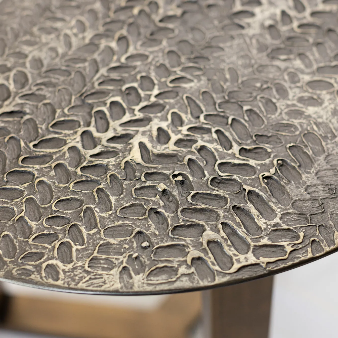 Tavolino rotondo con base in metallo bronzeo e tre gambe inclinate che convergono elegantemente al suolo. Il piano, in una tonalità di grigio, è impreziosito da un motivo a petali in bassorilievo e rifinito con pigmenti metallici che creano un effetto ferro bronzeo testurizzato. Le dimensioni personalizzabili lo rendono un elemento versatile, perfetto per ambienti living che richiedono un equilibrio tra funzionalità e design ricercato. Per maggiori informazioni, è possibile contattare il Concierge.