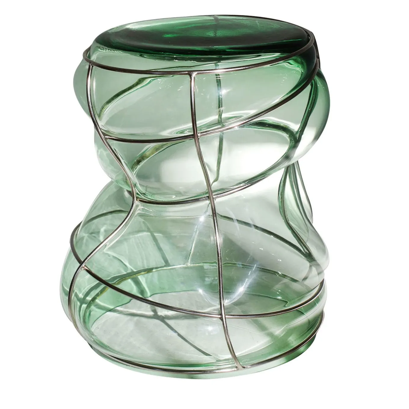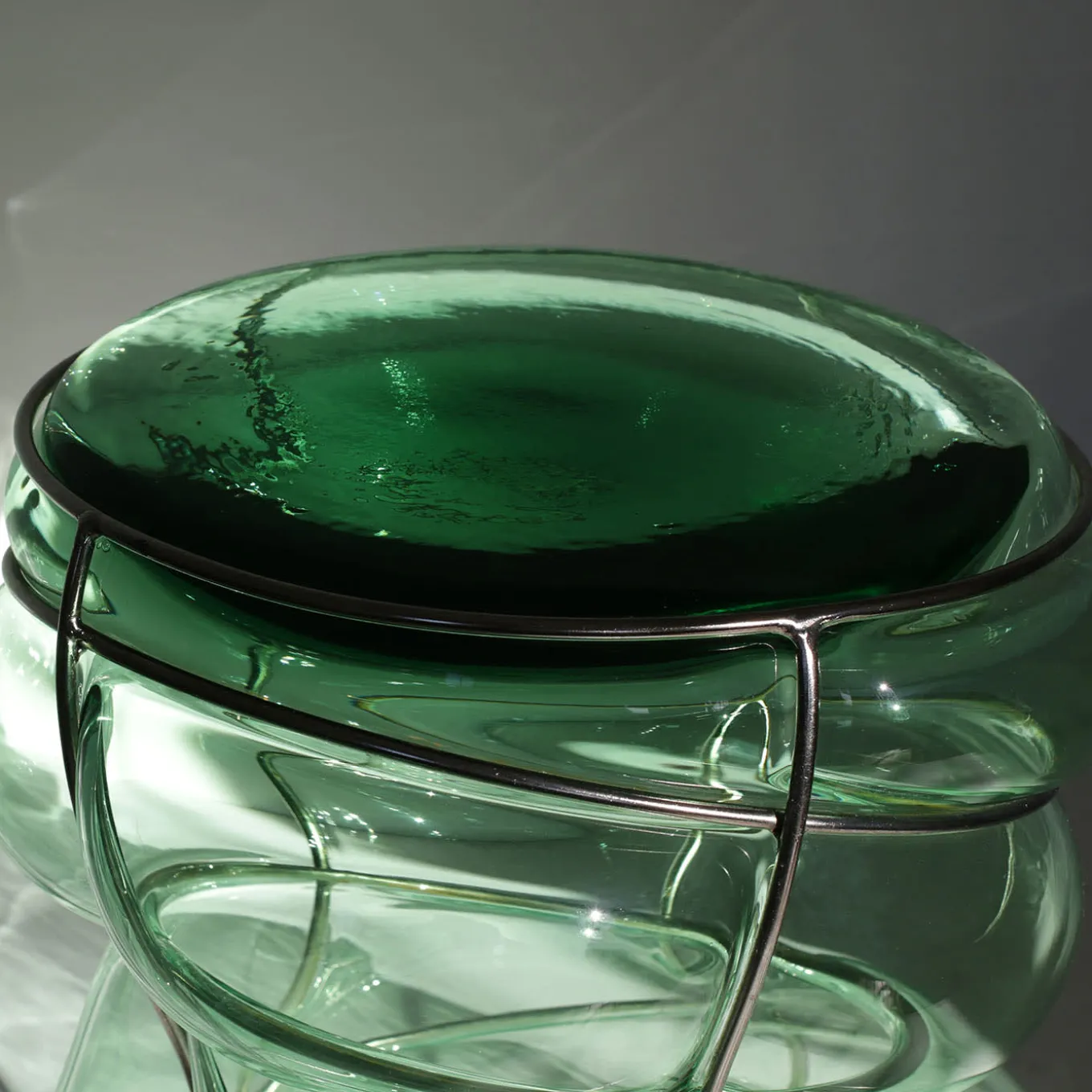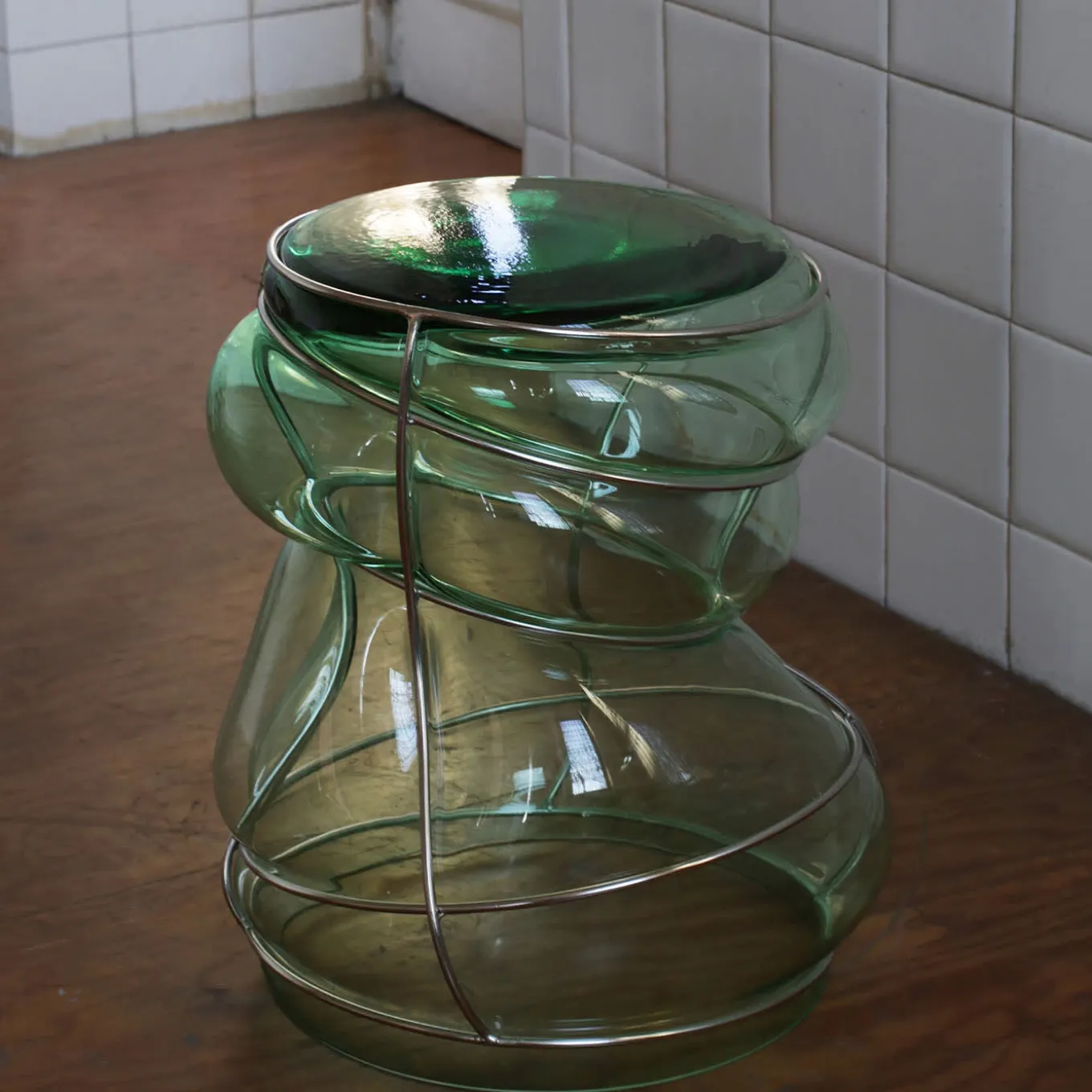 Con il tavolino Babà, l’artista-designer Alice Crepaldi esplora le possibilità e i limiti della tradizionale tecnica del vetro soffiato a gabbia di Murano. L’ambizione di questo progetto è stata quella di indagare le dimensioni massime possibili della gabbia metallica e delle sue aperture oltre le quali il vetro non può andare, testando così la capacità di espansione del vetro e la sua resistenza strutturale. Attualmente in verde, è disponibile in diversi colori come l’ambra e il blu. La replica può presentare leggere variazioni dovute a un processo di produzione artigianale. Ogni manufatto è unico: l’altezza, la “pienezza”, il taglio e la sfumatura del colore dipendono dal momento esatto in cui il vetro viene soffiato all’interno della gabbia metallica dal Maestro vetraio. Disponibile solo in verde turchese con finitura in metallo nero grezzo.