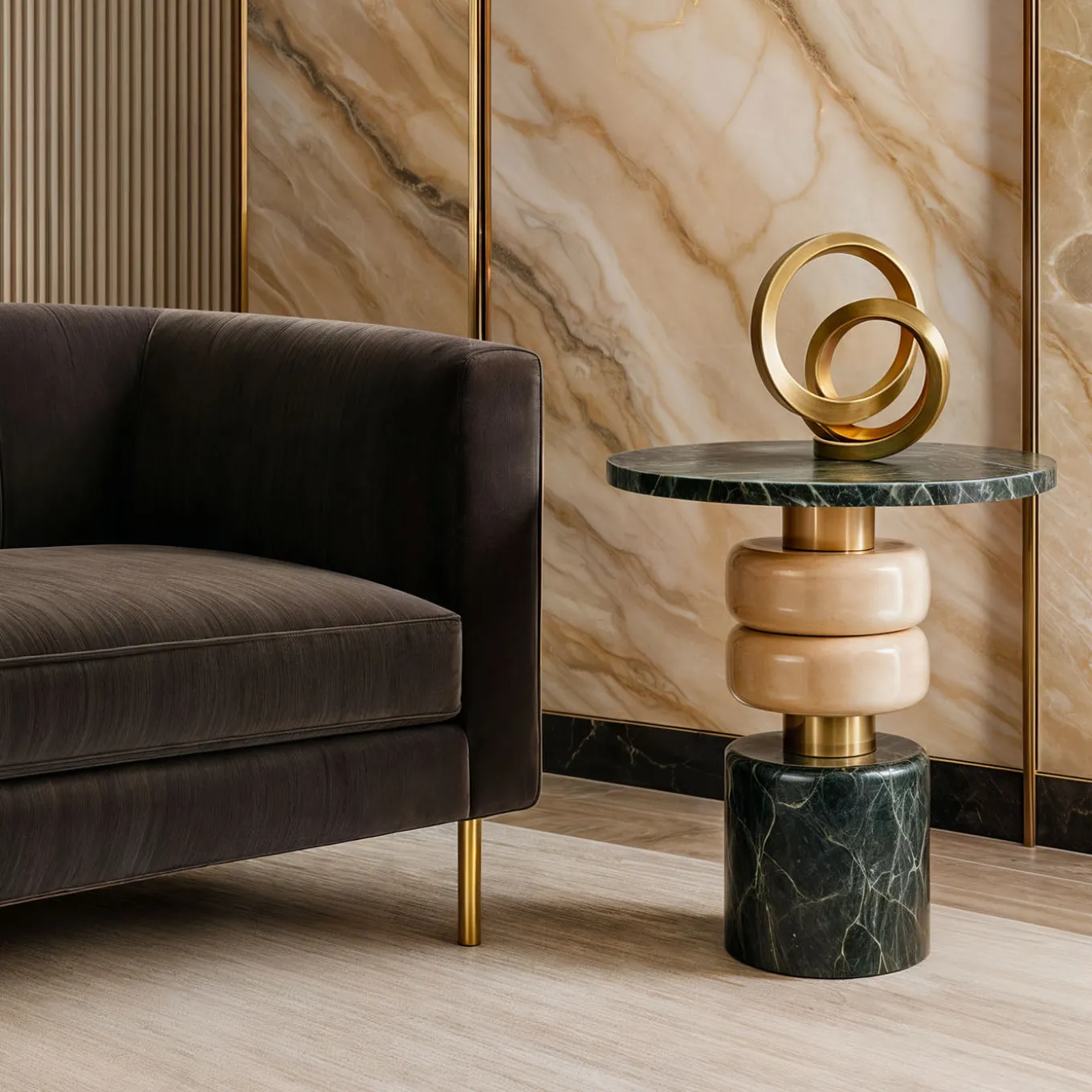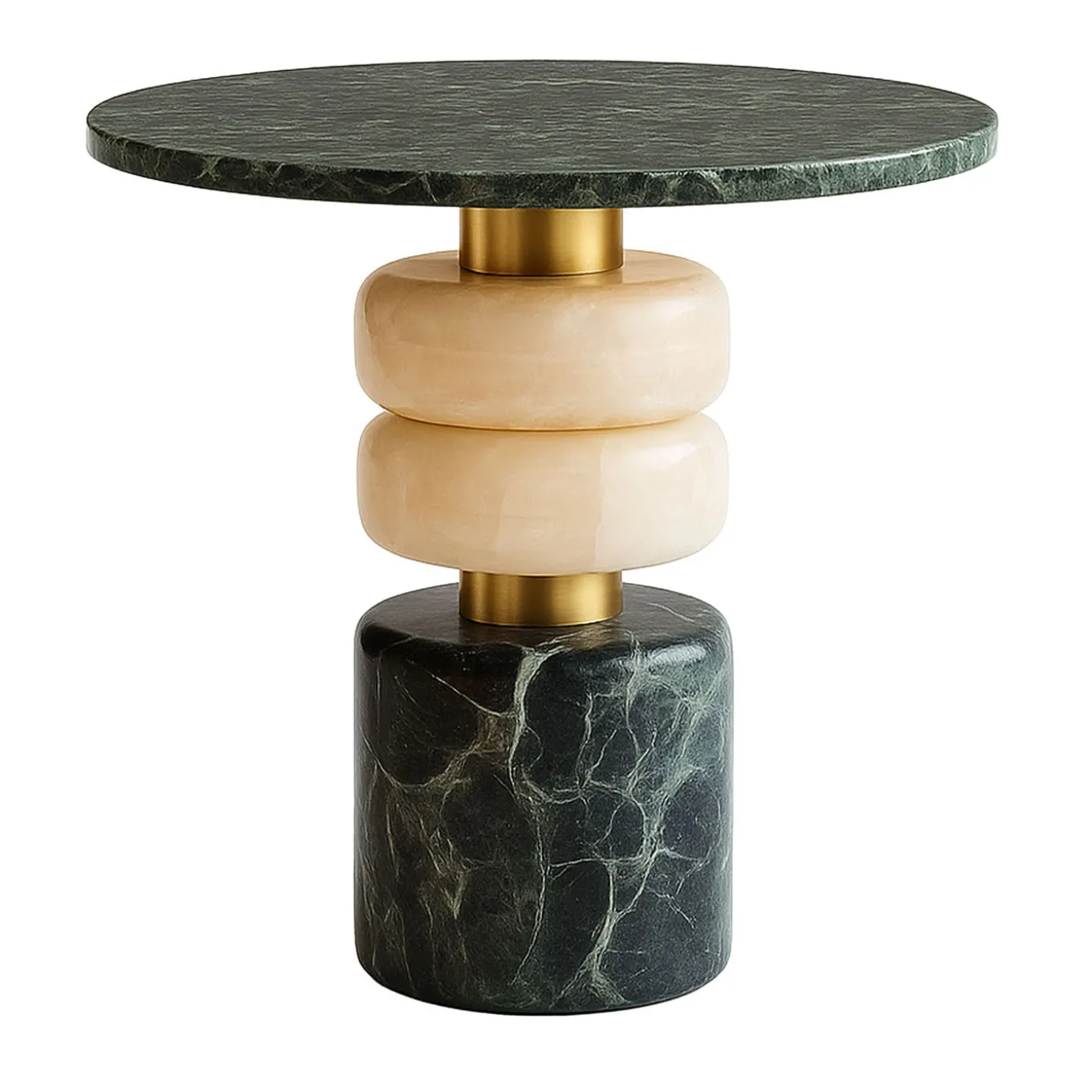 Il tavolino laterale Marsmallow in onice e marmo Verde Alpi di Ashley Gadeova presenta un design scultoreo che combina forme morbide e arrotondate con un contrasto notevole tra toni di verde profondo e beige morbido. Le forme armoniose e le ricche texture del marmo evocano un senso di eleganza naturale e femminilità. Accentuato da dettagli metallici sottili, questo raffinato tavolino laterale aggiunge un elemento audace e artistico agli interni contemporanei.