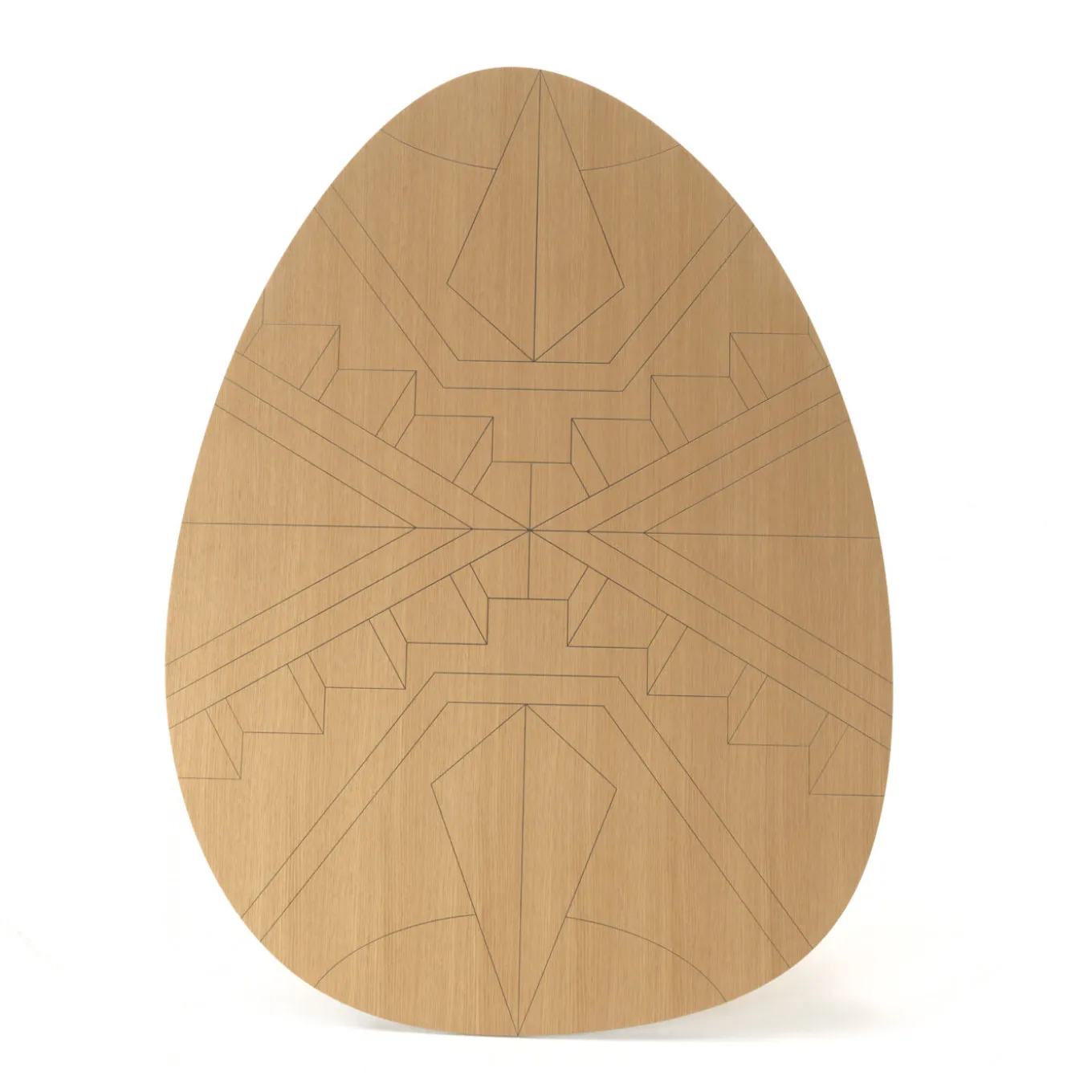 Il piano di questo tavolino asimmetrico e delicato è ornato da decorazioni geometriche ispirate ai geroglifici del deserto di Nazca. Il piano è in legno di quercia e le gambe in legno massiccio di quercia.