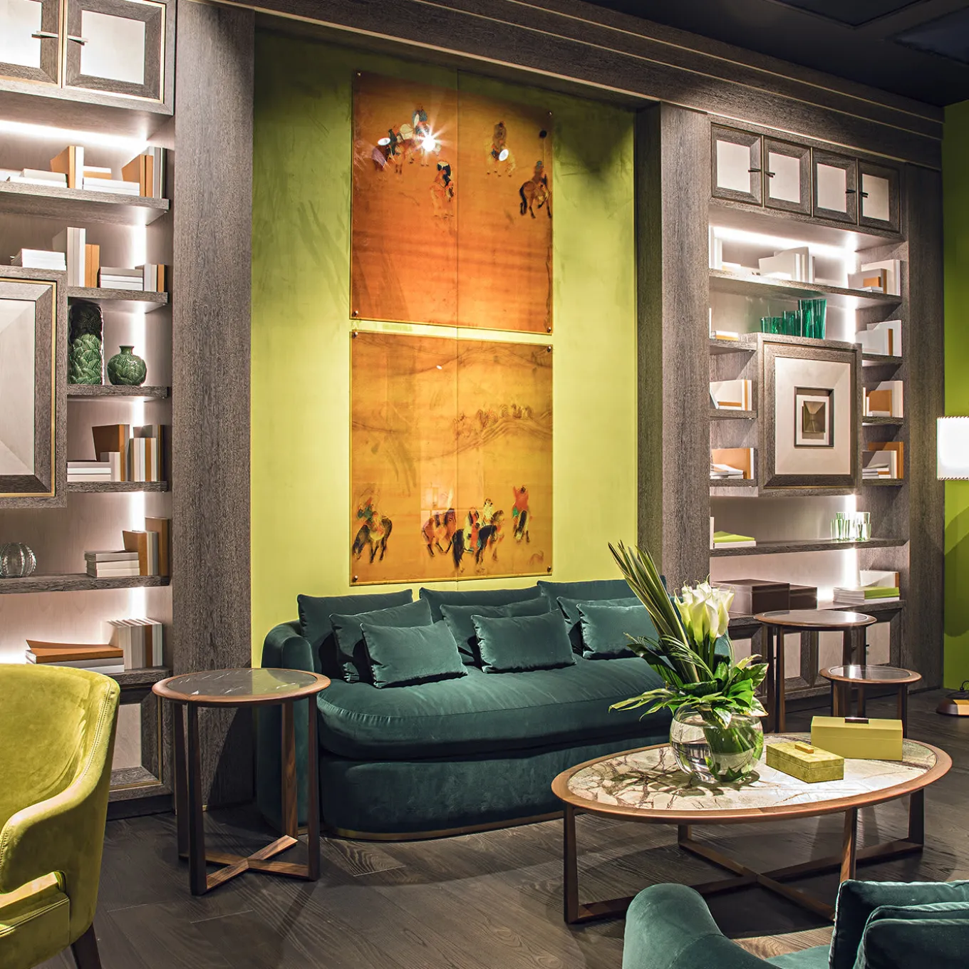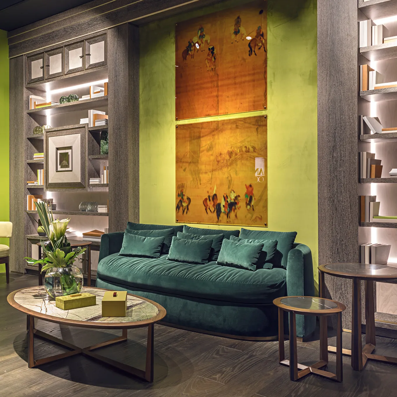 L’incantevole estetica che definisce questo tavolino in noce canaletto lo rende un sofisticato punto d’incontro. Due elementi angolari si intersecano alla base per creare una robusta struttura a croce che funge da supporto dinamico per il piano ovale, su cui è appoggiata una sottile lastra di marmo Forest Green. La componente in marmo conferisce al design una personalità superba con le sue venature naturali e selvagge.