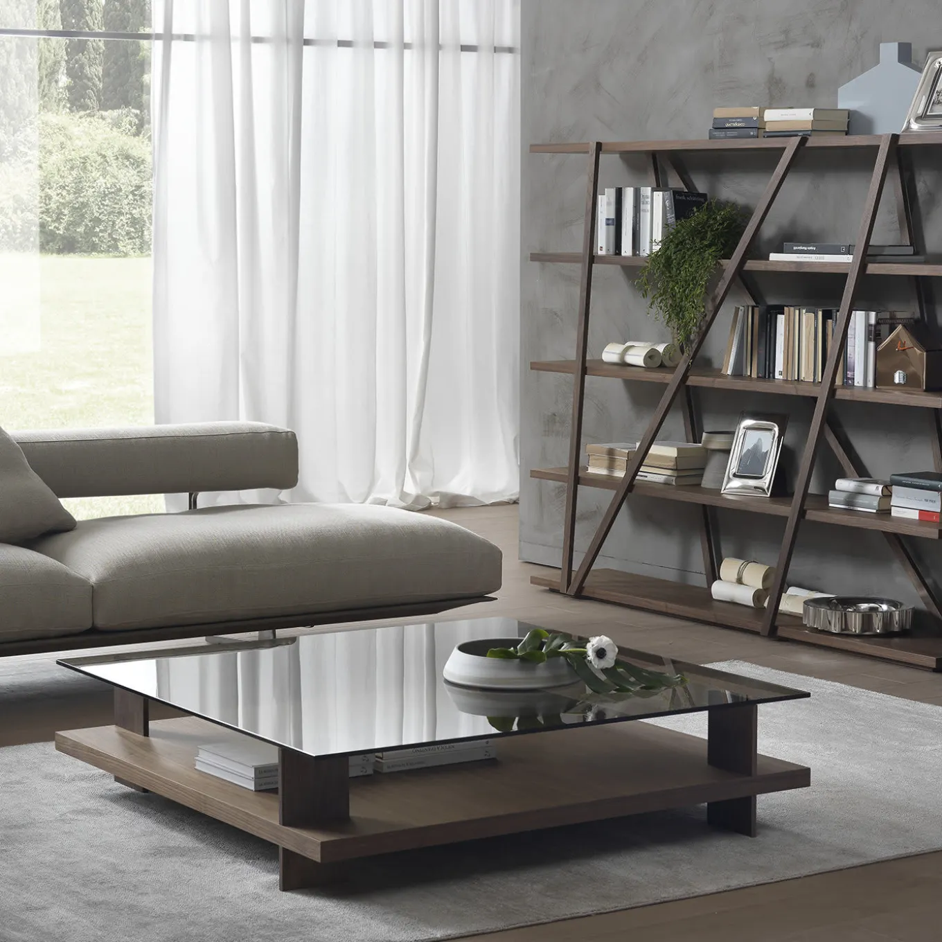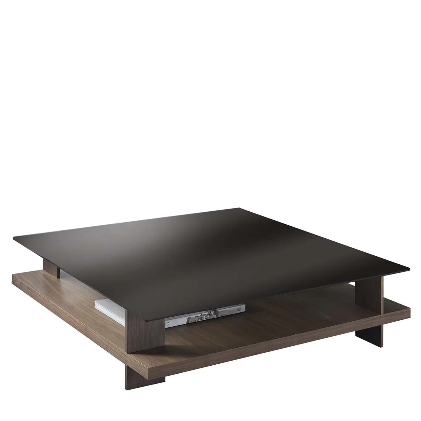 Parte della collezione Corallo, questo tavolino quadrato è sia funzionale (perché offre due superfici espositive visibili) che decorativo (grazie alla sua silhouette solida e armoniosa e all’uso di materiali naturali). Il piano superiore è in vetro trasparente-bronzato ed è sostenuto da una struttura in legno impiallacciato noce canaletto che comprende un piano inferiore trafitto dalle quattro gambe verticali. Anche i dettagli in alluminio sono impiallacciati in noce canaletto. Questo pezzo è disponibile anche con piano in vetro trasparente e finitura tinta wengé o nera; si prega di informarsi presso il Concierge.