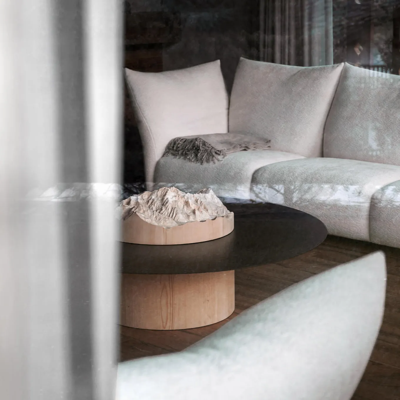 Da una cortina di nuvole spuntano i profili delle montagne dalle cime metalliche. Con picchi e cime di diverse altezze, il tavolino disegna paesaggi domestici che raccontano la storia di ogni montagna. Il risultato è un tavolino unico, composto da un disco di metallo e da una montagna intagliata su legno massiccio, fedele alla topografia reale. Il soggetto della montagna, la scala topografica e le dimensioni del tavolino possono essere personalizzati su richiesta (chiedere al servizio di Concierge per maggiori dettagli).