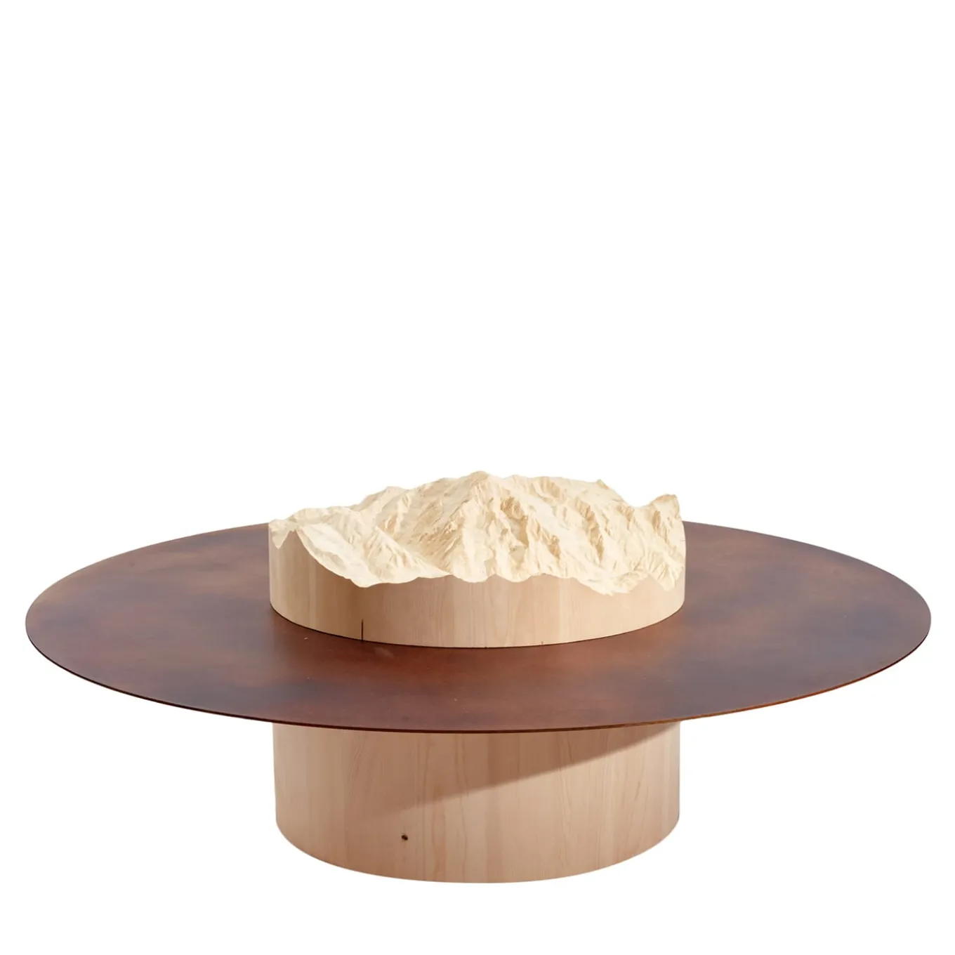 Da una cortina di nuvole spuntano i profili delle montagne dalle cime metalliche. Con picchi e cime di diverse altezze, il tavolino disegna paesaggi domestici che raccontano la storia di ogni montagna. Tip è un tavolino unico, composto da un disco di metallo e da una montagna intagliata su legno massiccio, fedele alla topografia reale. Il soggetto della montagna, la scala topografica e le dimensioni del tavolino possono essere personalizzati su richiesta (chiedere al servizio di Concierge per maggiori dettagli).