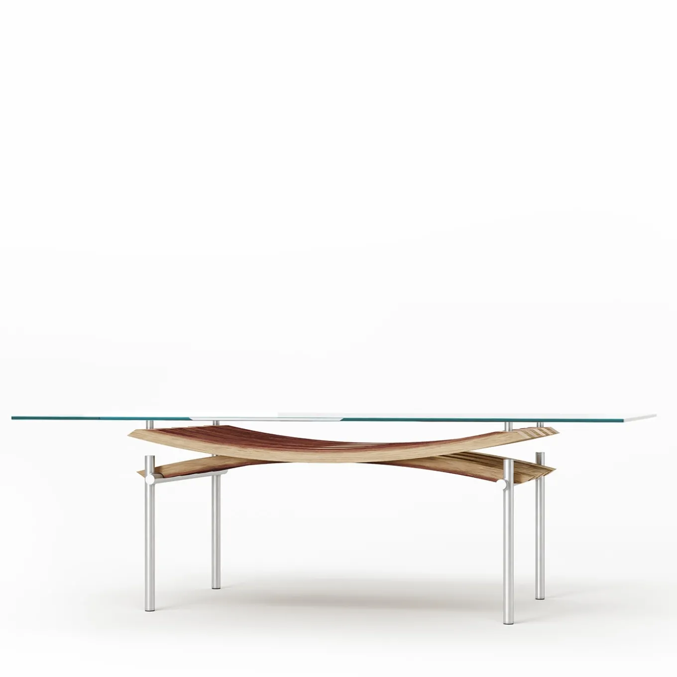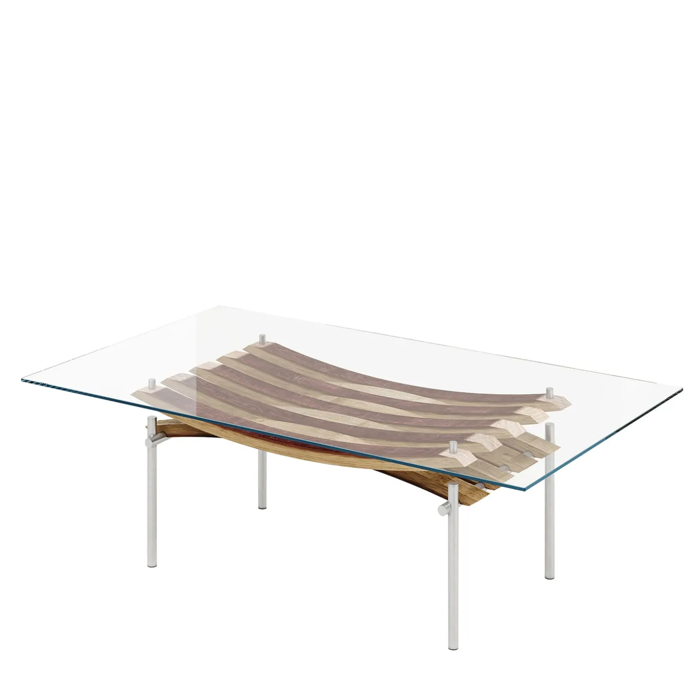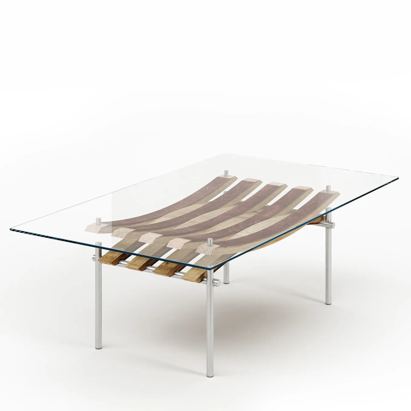 Il gioco delle doghe, orchestrato dalla disposizione alternata “esterno-interno” dei colori e dei segni del vino, infonde vitalità e armonia. La struttura in acciaio spazzolato che sostiene Vinci è ingegnosamente divisa in due elementi interconnessi. Le sue gambe si fondono perfettamente con il rovere attraverso una struttura tubolare, estendendosi con grazia per sostenere il piano in vetro con ulteriori elementi tubolari in acciaio.