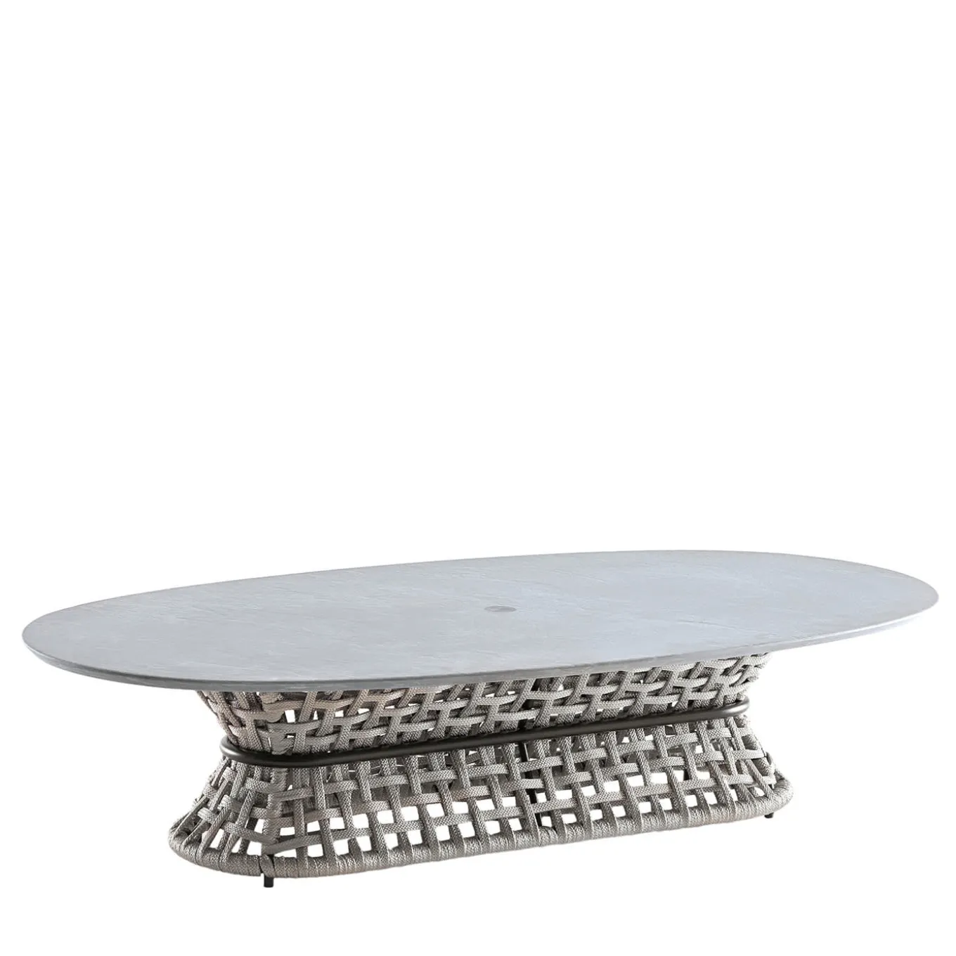 Tavolo da cocktail ovale per esterni in combinazione di metallo nero satinato trattato in cataforesi e cordame intrecciato grigio chiaro. Piano in doghe di pietra naturale trattata “CARDOSO” con logo Giorgio Collection inserito. Speciale copertura per esterni inclusa nel prezzo. Design di Castello Lagravinese Studio.