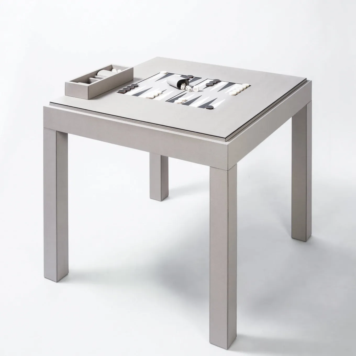 Questo splendido tavolo è la superficie ideale per giocare a backgammon, scacchi e dama con stile. La struttura in legno è rivestita in pelle e presenta gambe rimovibili, in modo da poter utilizzare entrambi i lati del piano smussato: un campo da backgammon con intarsi in pelle su un lato e una scacchiera intarsiata sull’altro. Sotto il piano, tre vassoi rivestiti in pelle con scomparti consentono di riporre le pedine degli scacchi in legno di bosso, le pedine del backgammon in acero e noce con inserti in pelle, due coppe per i dadi, dadi standard e un cubo per il raddoppio.