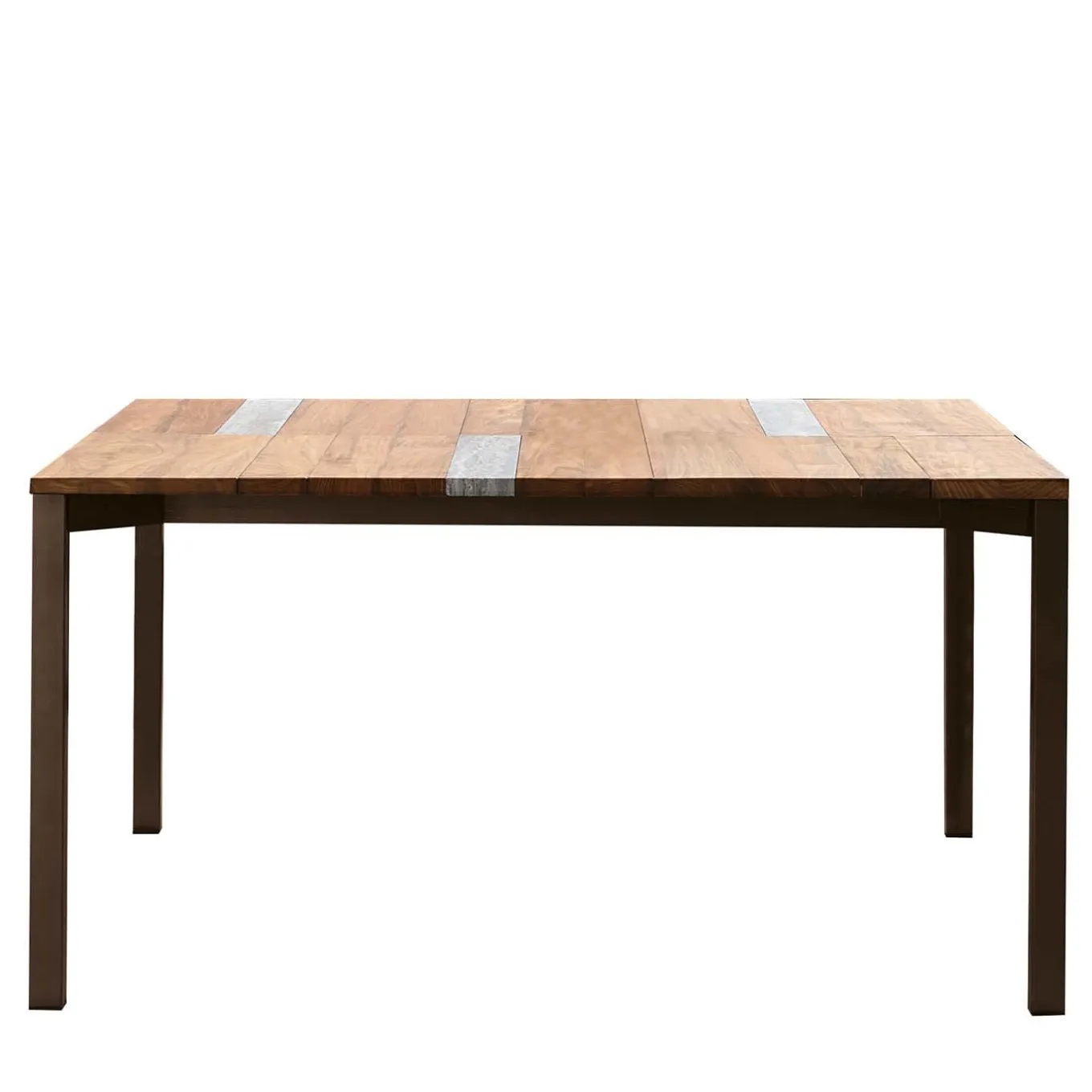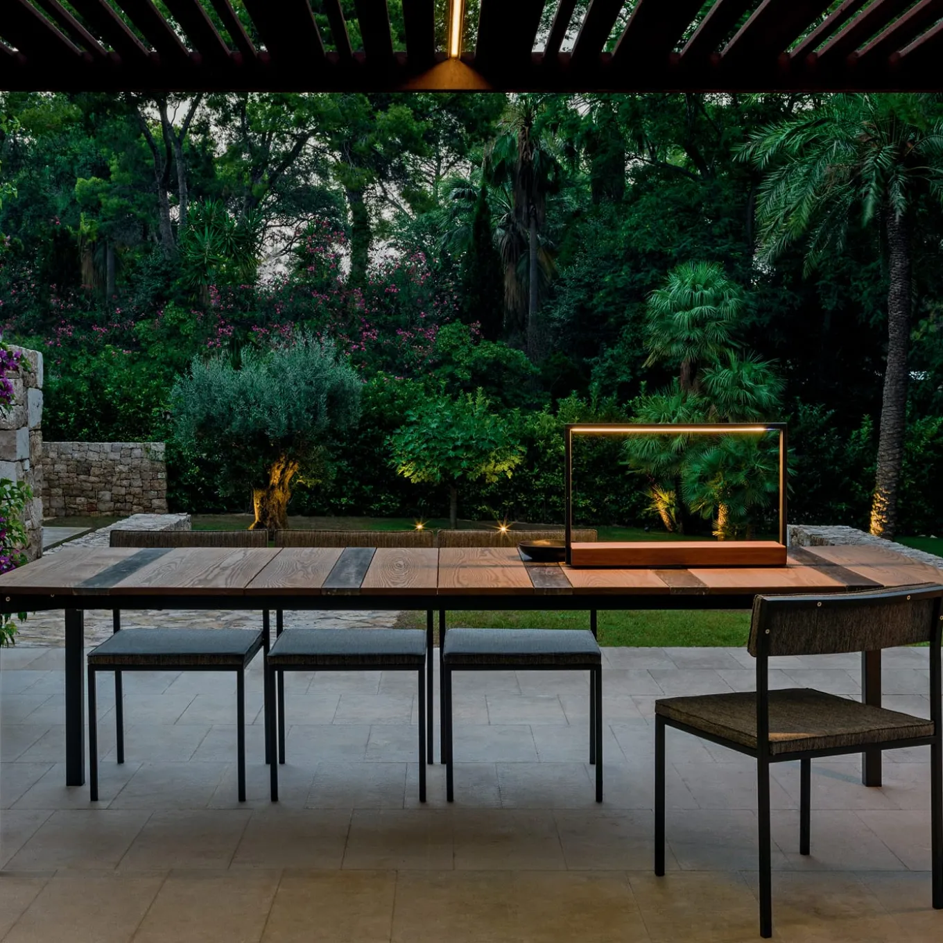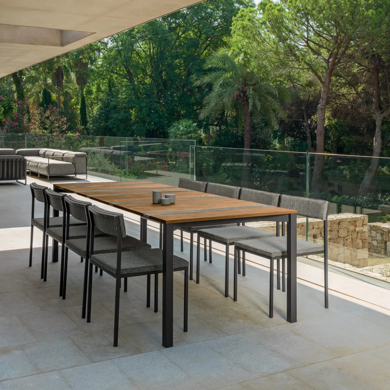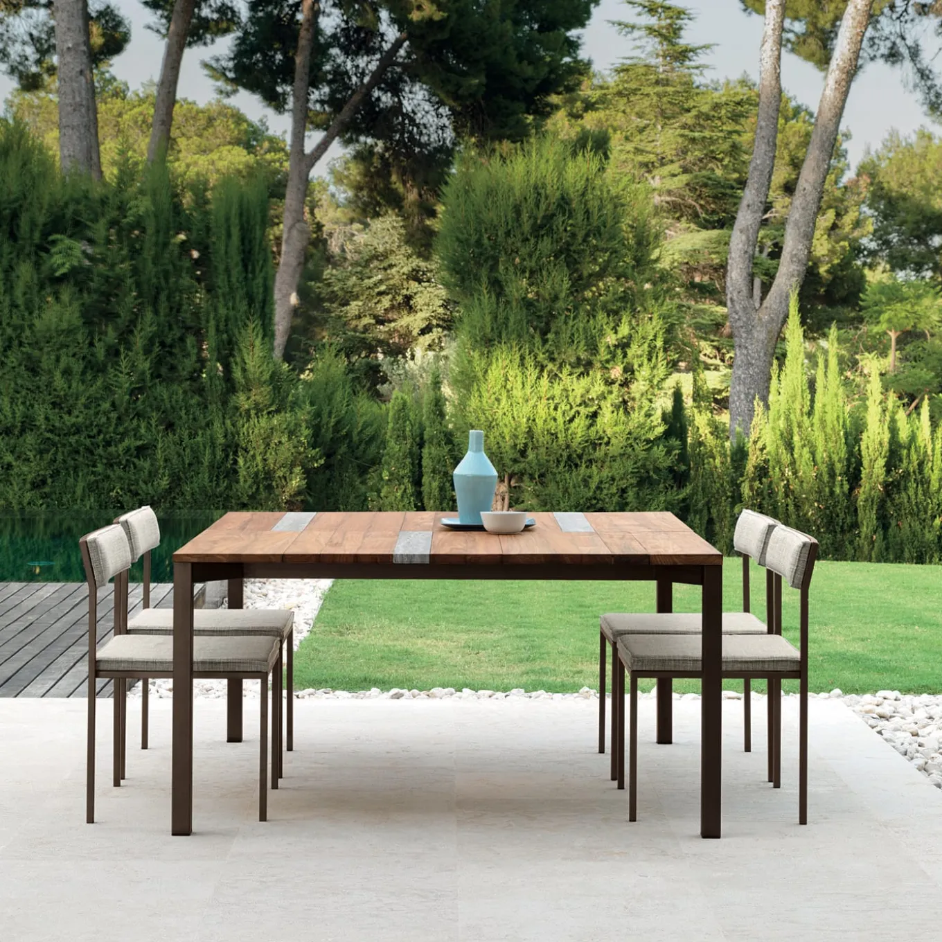 Unendo due materiali nobili, ciascuno caratterizzato da texture e venature uniche, questo esclusivo tavolo da pranzo è definito da una forte qualità grafica. Il piano, semplice ma di grande effetto, è costituito da doghe in legno di iroko marrone dorato e travertino titanio che creano un motivo geometrico. Durevole e robusto, la silhouette classica e il profilo elegante rendono questo tavolo adatto a interni sia minimalisti che postmoderni. Disponibile anche con struttura in oro e bianco o con struttura in grafite e legno di pietra. Può ospitare fino a 8 persone.