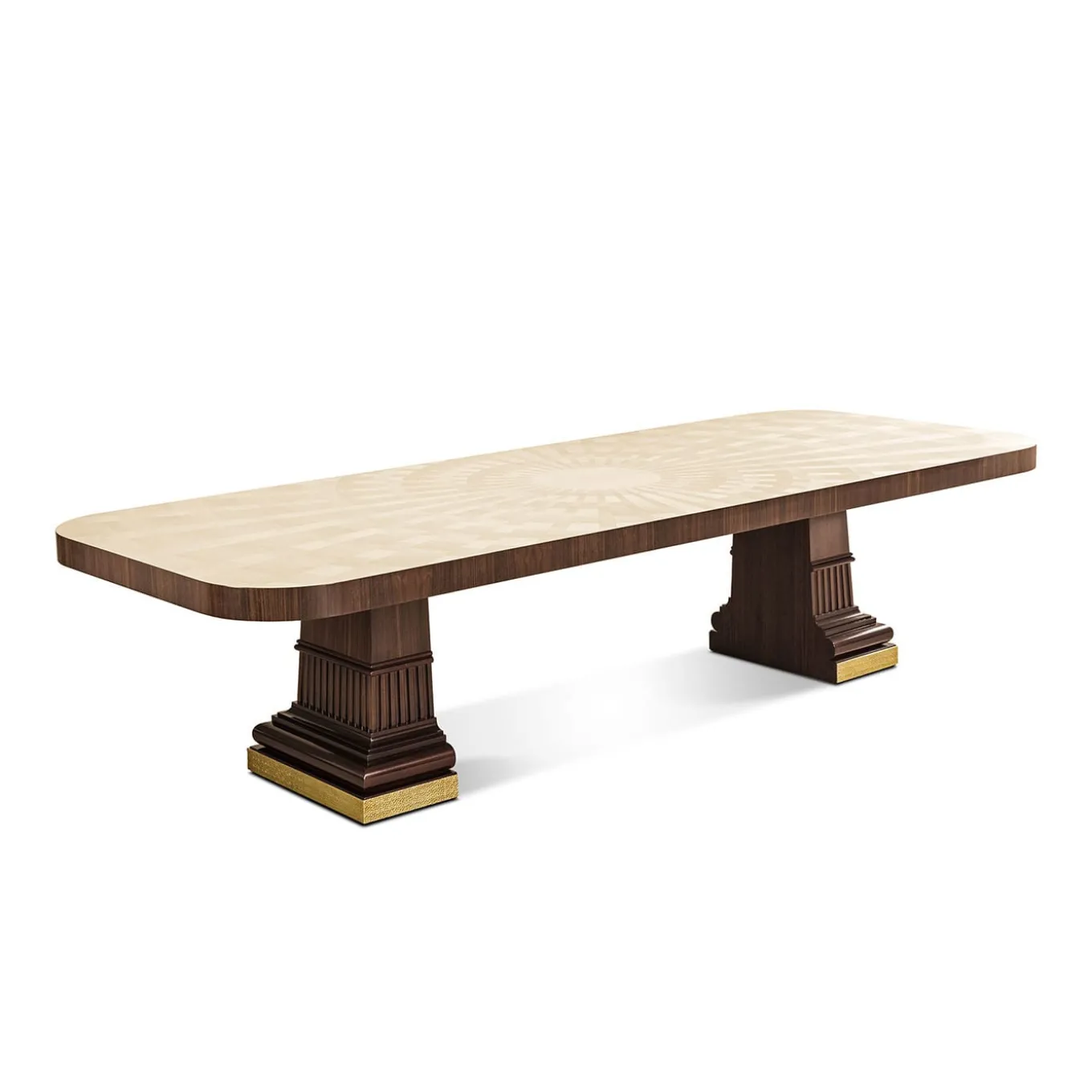 Tavolo da pranzo con piano in acero naturale intarsiato e piedistalli in palissandro e mogano massiccio.
