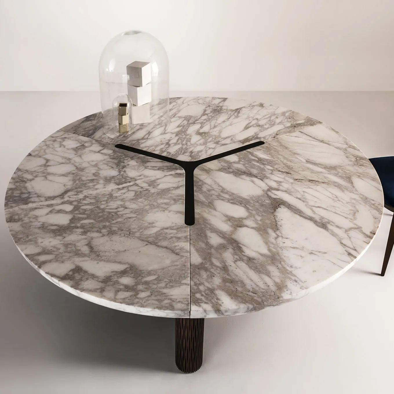 Questo bellissimo tavolo da pranzo rotondo presenta un piano in marmo lucido opaco con inserti in ottone brunito al centro. Il piano del tavolo poggia su una solida struttura in legno rifinito in bronzo con una struttura increspata per un effetto accattivante. Questo pezzo unico sarà una bella aggiunta a qualsiasi casa o ufficio.
