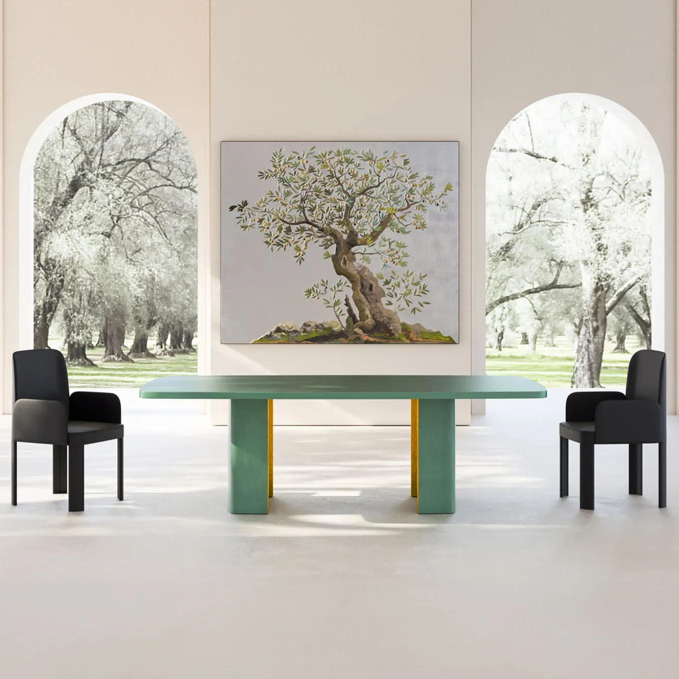 Linee pulite e delicati angoli arrotondati tracciano la silhouette di questo raffinato tavolo contemporaneo, che deve il suo aspetto accattivante a un’audace combinazione cromatica. Una speciale finitura a gesso “scagliola” caratterizza il piano e le gambe con taglio a C, il cui interno offre un inaspettato accento di lusso grazie alla placcatura in ottone lavorato a mano. Contattare il Concierge per le opzioni di personalizzazione.