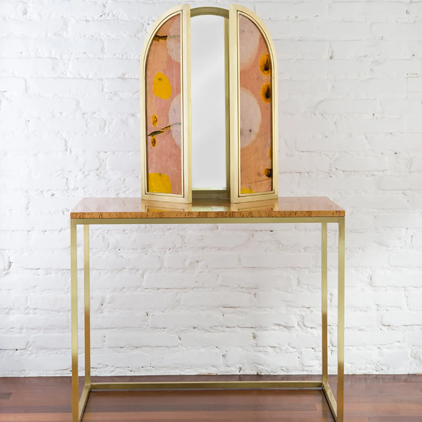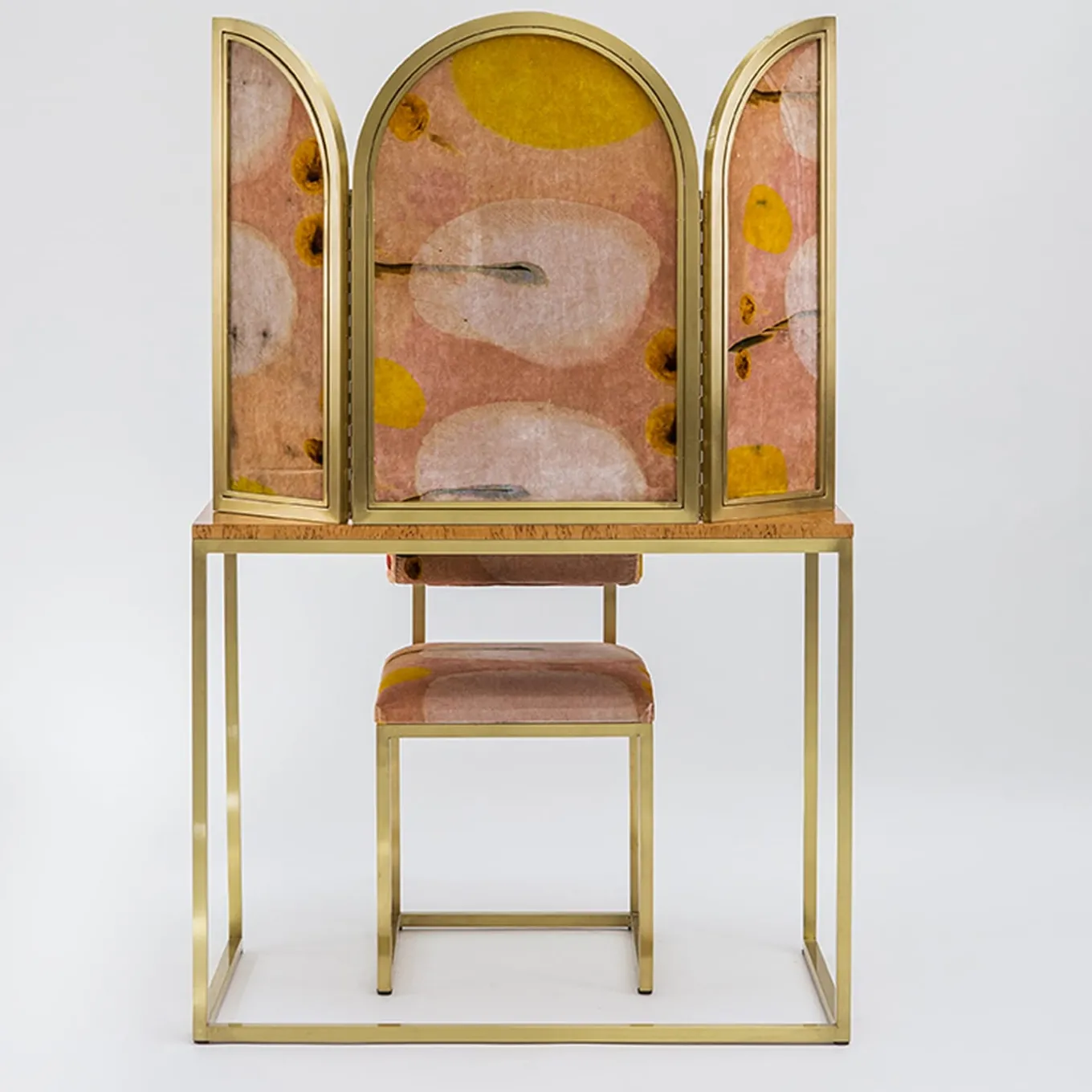 Il nome del progetto parla della sensazione di attesa e di eccitazione che precede un incontro ed è profondamente legato allo scopo degli oggetti: panche, sgabelli, uno specchio, un tavolo da toilette e un divisorio. Awaiting è una collezione femminile e sensuale che mescola il gusto del classico e del contemporaneo in mobili realizzati in ottone dorato, vetro e velluto.