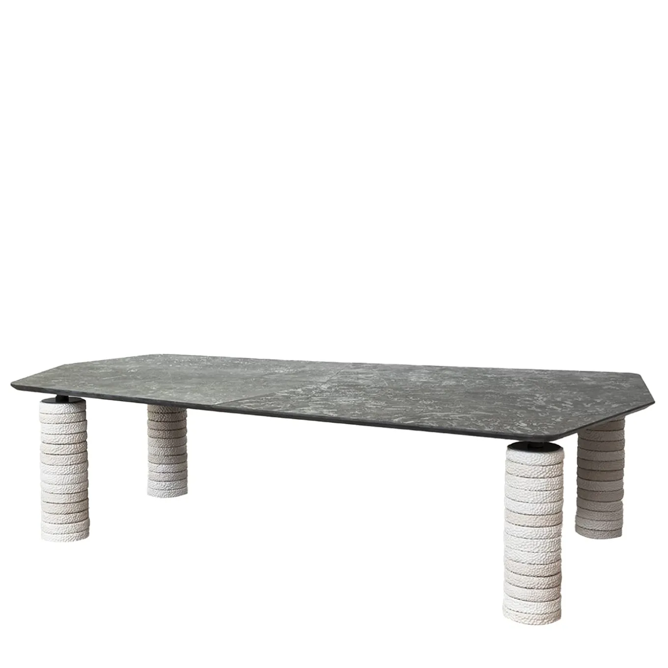 Maestoso e scultoreo, questo tavolo è stato progettato per stupire con i suoi audaci tratti di riferimento geometrico e le sue squisite caratteristiche naturali. Il piano in Bluestone, robusto e resistente all’acqua, è stato tagliato con la tecnica del getto d’acqua e poggia su quattro gambe cilindriche in gres, costituite da anelli accuratamente martellati. Sia all’interno che all’esterno, il tavolo è sicuramente al centro dell’attenzione.