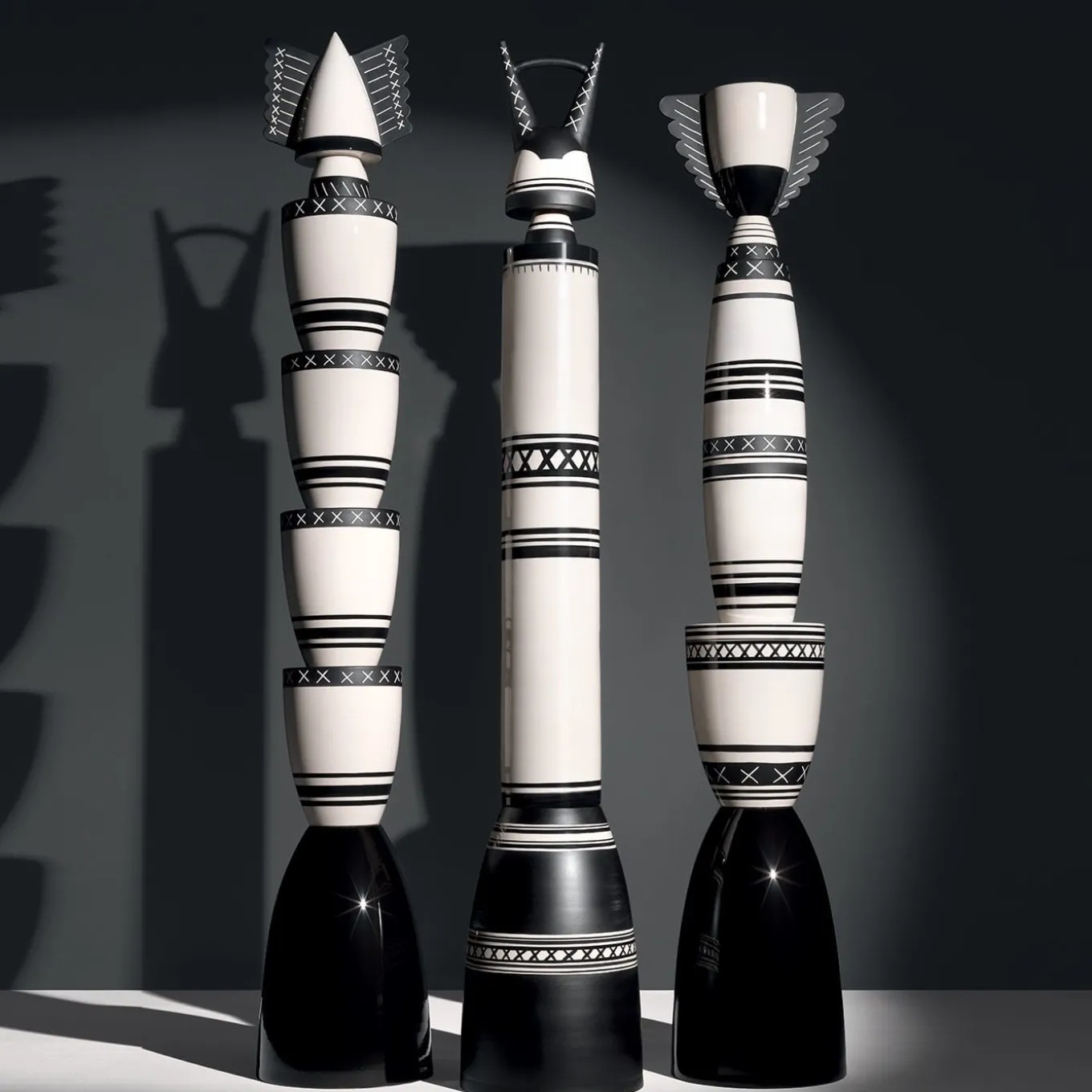 Velocità in bianco e nero. Un ritmo tribale si dispiega, guidato da geometrie e architetture magiche in cui convergono energie e anime. Vasi conici e sferici si intrecciano con linee e croci in un suggestivo rituale in bianco e nero. Questo totem, composto da quattro pezzi di argilla fatti a mano, presenta uno smalto nero opaco, una barbottina bianca dipinta con accenti neri e una finitura cristallina trasparente. Edizione limitata di 9 pezzi, disegnata da Ugo La Pietra.