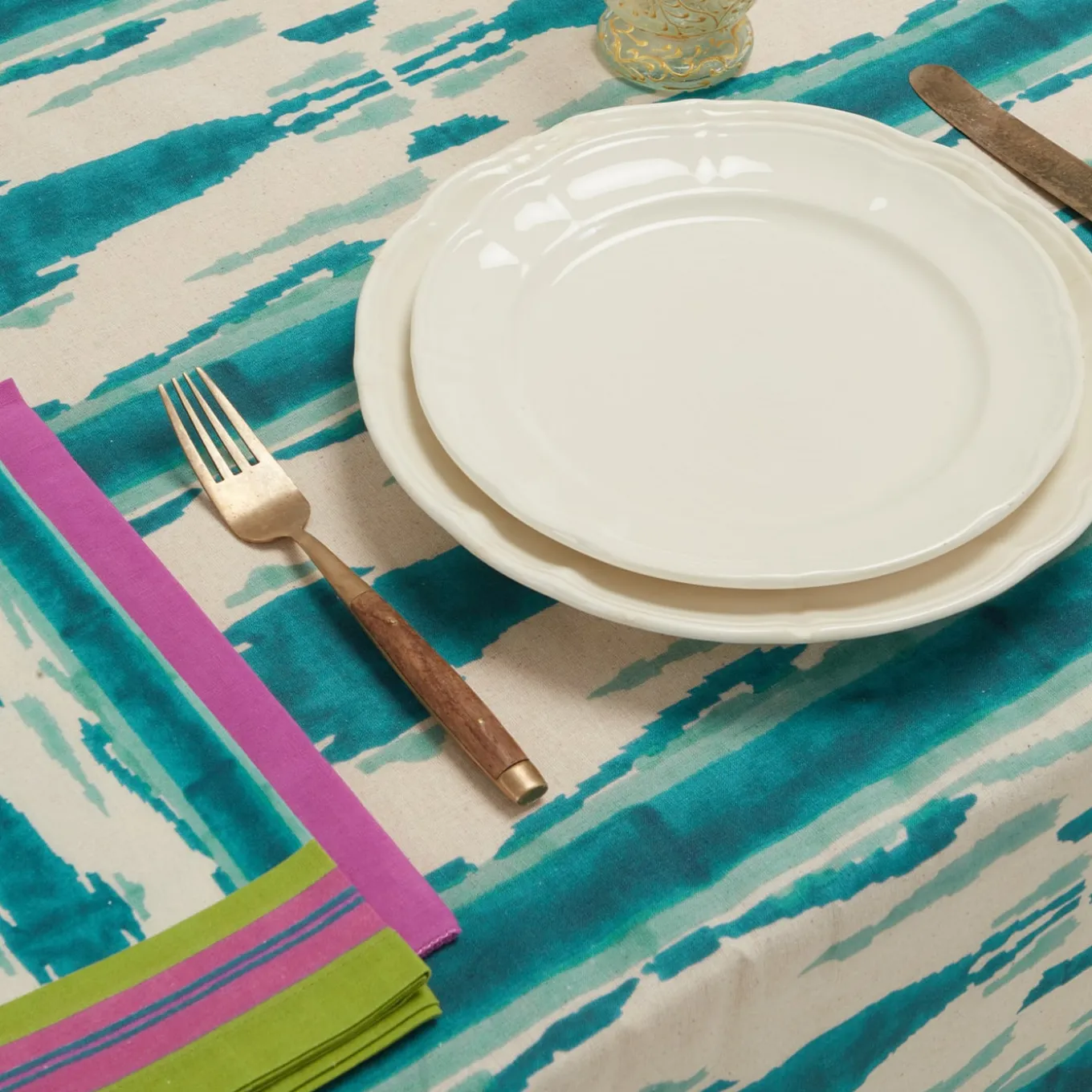 Disponibile in altre vivaci opzioni di colore, questa squisita tovaglia in pregiato cotone è un pezzo unico stampato secondo la tradizionale tecnica manuale della “stampa a blocchi”, per un motivo ipnotico che ricorda i motivi tipici del piumaggio dei pavoni. Strisce rosa, blu e verde acido si alternano lungo i bordi, creando un audace effetto cornice che aggiunge ulteriore vivacità cromatica al pezzo. Stampato digitalmente in Italia.