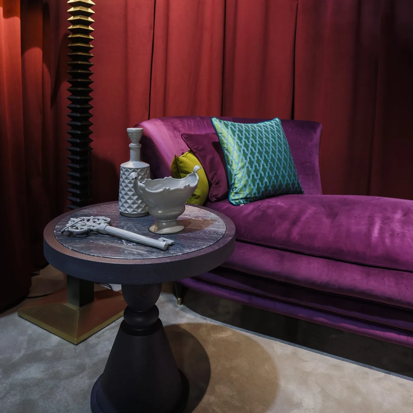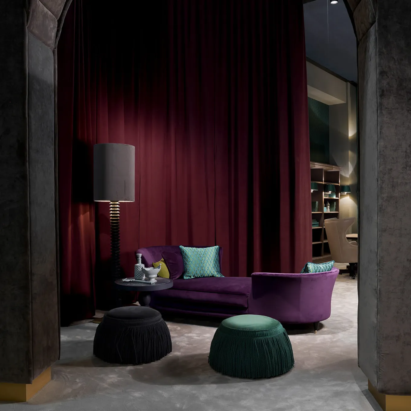 La chaise longue Triclinia alterna la sinuosità di un grande cuscino da seduta alle linee rette che delineano i due schienali, composti da due curve posizionate alle estremità opposte della chaise, creando così un’intima posizione di fronte. La base in legno è sostenuta da sottili piedini, pensati per slanciare la forma di Triclinia e renderla un oggetto femminile e aggraziato.