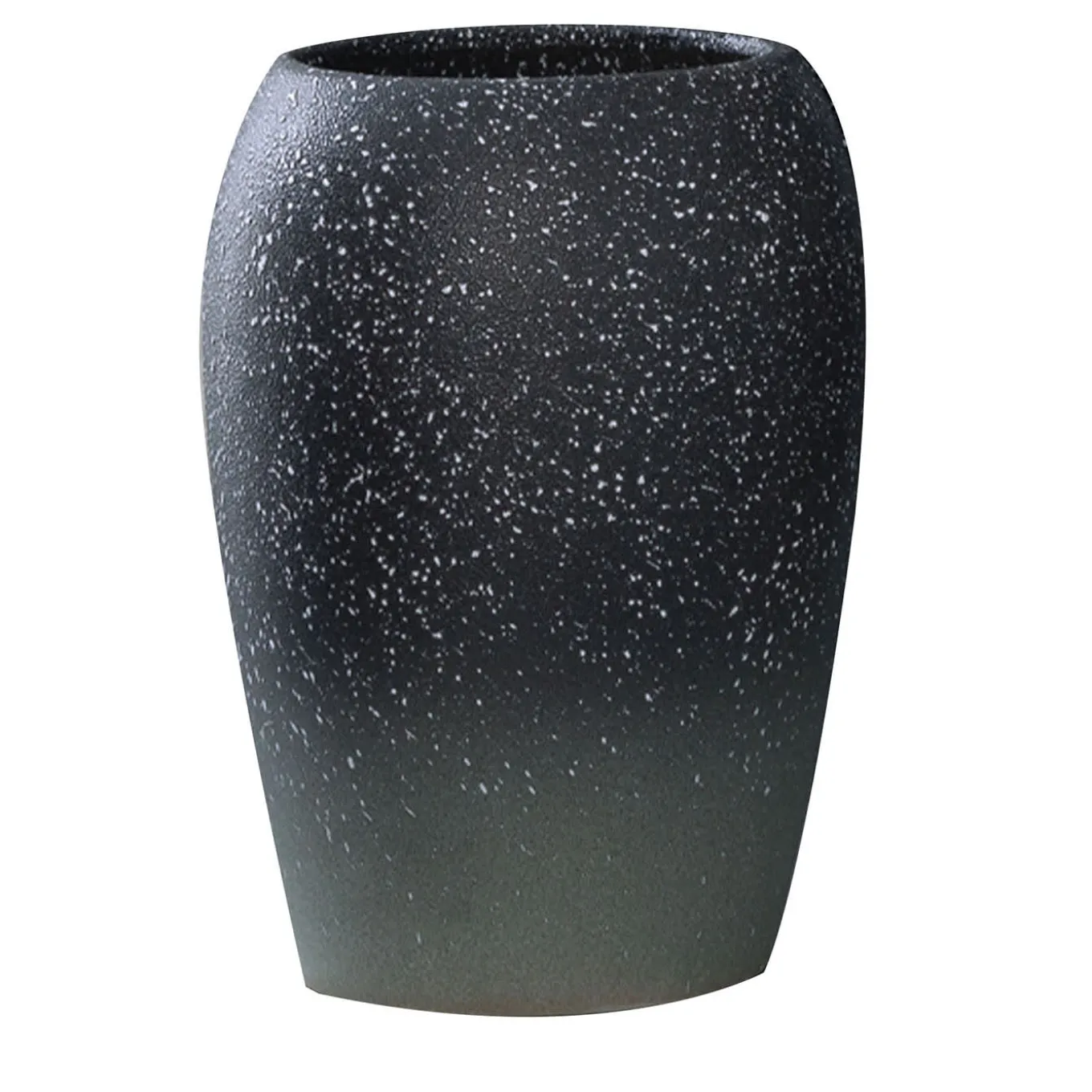 Un corpo rigonfio che ricorda vagamente un bozzolo definisce questo prezioso vaso in ceramica, un pezzo unico realizzato a mano sotto la supervisione di maestri artigiani. Essiccato naturalmente e cotto a oltre 1000°, presenta una colorazione scura e sfumata, interrotta solo da un motivo di macchioline bianche. Sintesi di artigianato tradizionale e stile contemporaneo, ogni pezzo è unico.