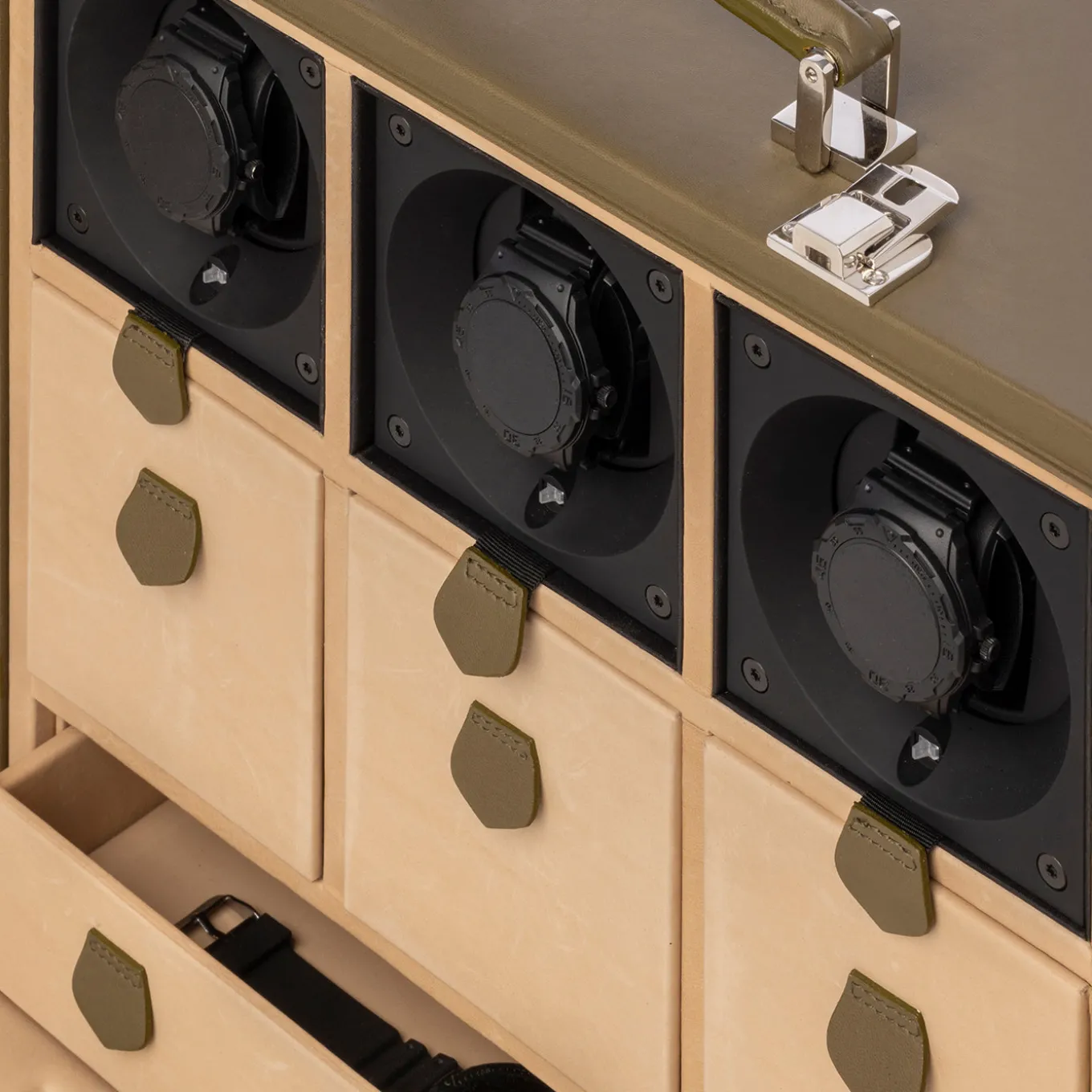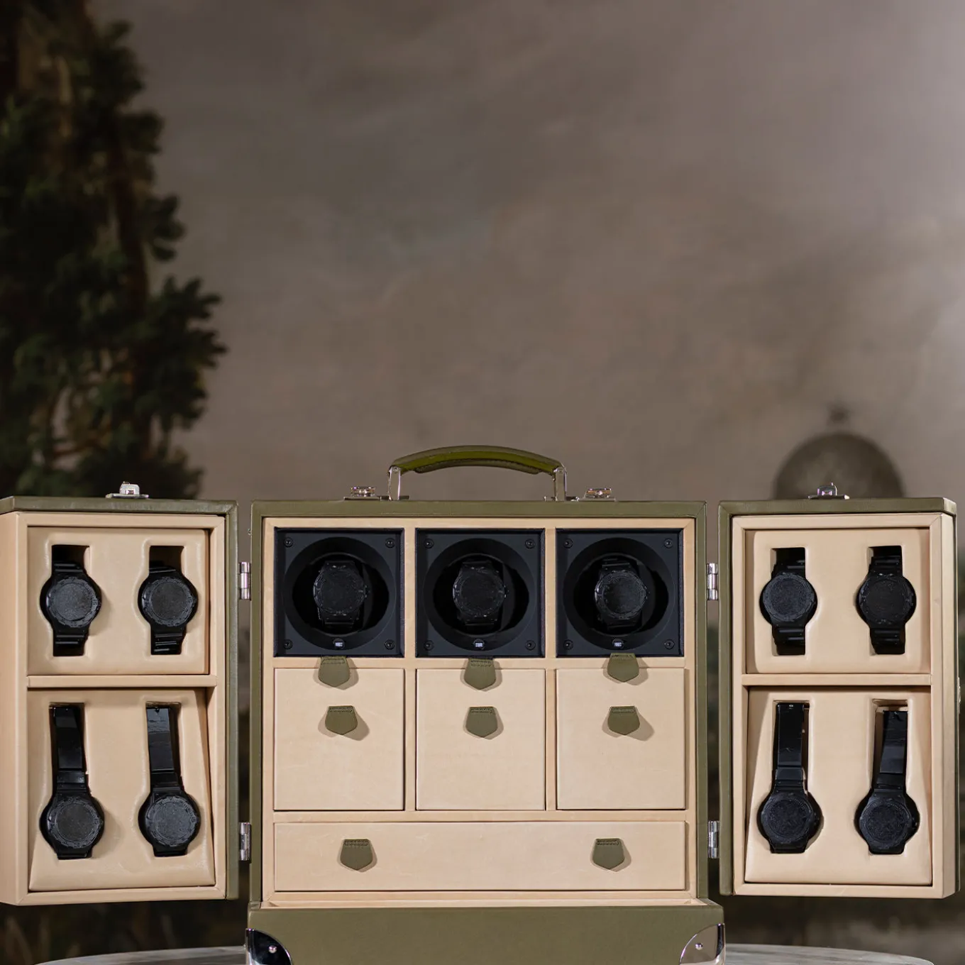 Il trunk per orologi Geneve è un oggetto compatto ed elegante, progettato specificamente per custodire orologi di valore. È dotato di un meccanismo automatico integrato che mantiene carichi gli orologi quando non vengono indossati. Il trunk presenta un esterno in pelle di agnello ultra-morbida, completato da accessori in ottone cromato puro e una robusta maniglia in pelle. L’interno è completamente rivestito in pelle di agnello, garantendo un ambiente lussuoso e protettivo per ogni orologio.