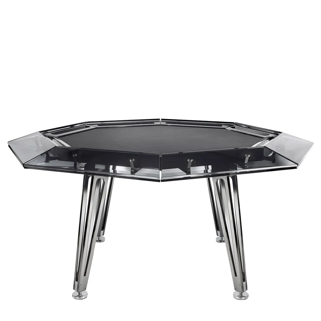 Vero e proprio gioiello per le sale da gioco di casa, questo tavolo da poker ottagonale per otto giocatori vanta un design accattivante e decisamente contemporaneo, ricco di materiali pregiati e angoli vivi. Quattro gambe strombate in metallo arricchite da una finitura cromata nera sostengono la struttura in vetro, ispirata all’aspetto e al taglio classico dei diamanti. Una cornice audace abbraccia il tappeto da gioco nero in Alcantara®. I braccioli in pelle sono disponibili a un prezzo aggiuntivo, mentre un sontuoso set da gioco è incluso nell’acquisto.