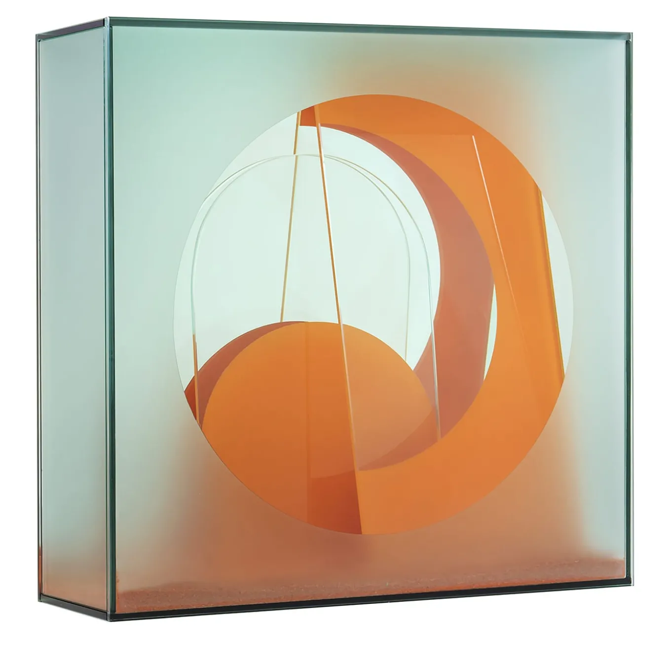 Un’illustrazione tridimensionale che prende volume e forma attraverso zone in luce e altre in ombra. La decostruzione dei riflessi su più livelli si definisce grazie all’alternanza calibrata di aree trasparenti, riflettenti, satinate o laccate, tutte collocate su un fondo di sabbia colorata che richiama le origini del vetro.