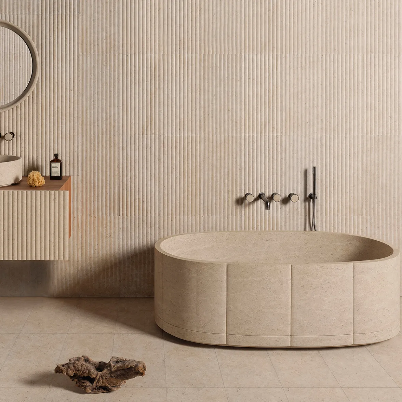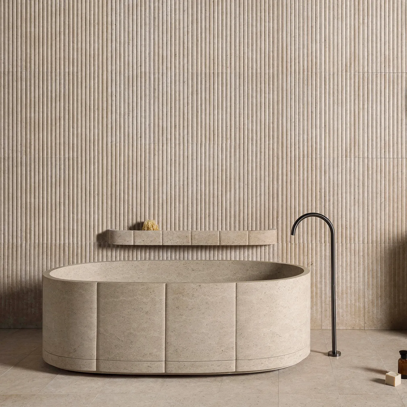 La vasca Sartoriale presenta una texture distintiva che esalta il suo fascino visivo. La sua superficie interna lucida garantisce una transizione fluida tra le pareti verticali e la base orizzontale, sottolineando un’eleganza raffinata. Una linea verticale continua corre attorno al perimetro, creando un sottile design a forma di “V” visibile dall’alto. La forma ovale ergonomica abbraccia delicatamente l’utente, elevando il bagno quotidiano a un ambiente marmoreo personalizzato e armonioso.