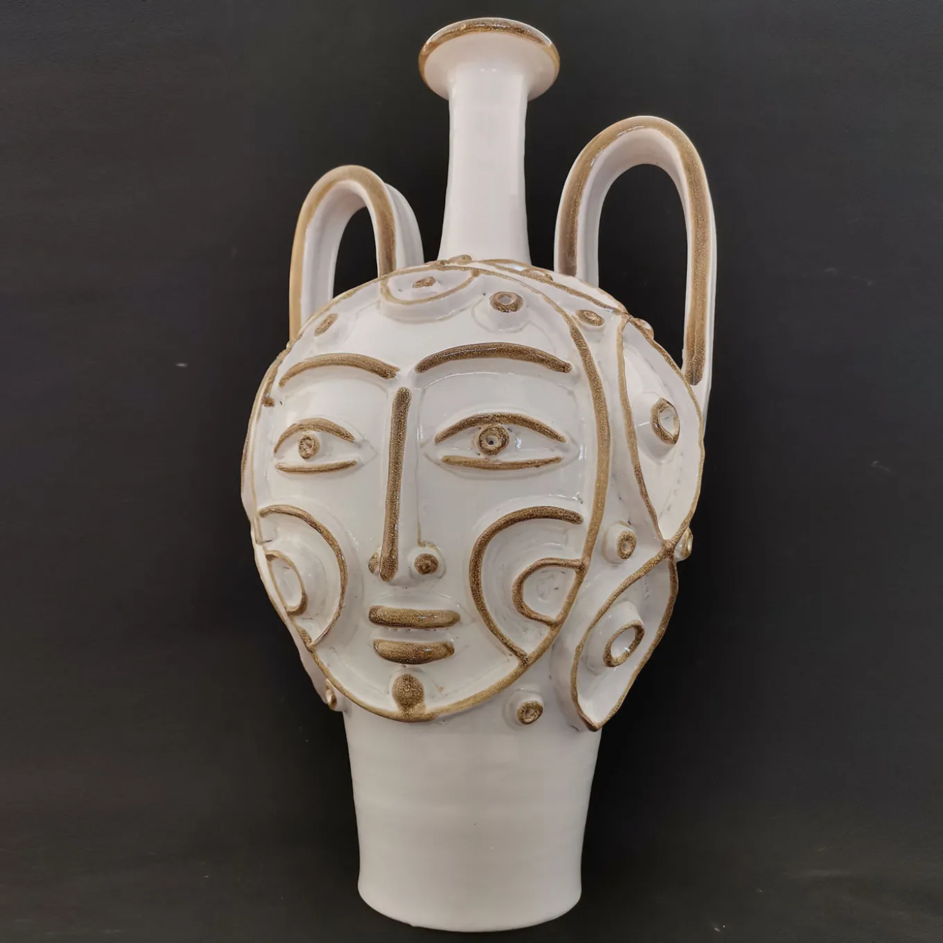 Pezzo irripetibile, pazientemente tornito, modellato e decorato a mano, questo vaso ad anfora seduce con i suoi tratti antropomorfi tracciati con linee nette. Gli ornamenti ad alto rilievo massimizzano l’impatto decorativo del pezzo, che risulta controbilanciato da un tranquillo smalto bianco con dettagli tracciati in un’elegante tonalità marrone tenue. Manici drammaticamente curvi e un collo lungo e stretto sigillano il design.