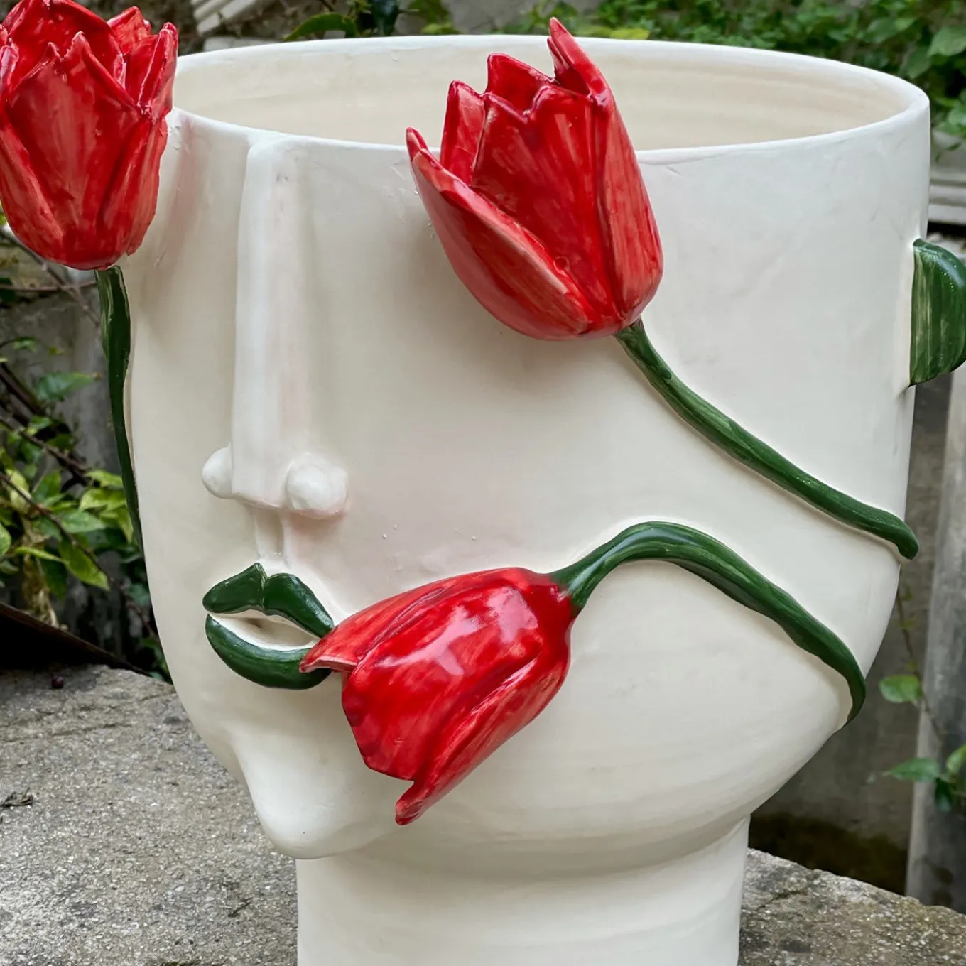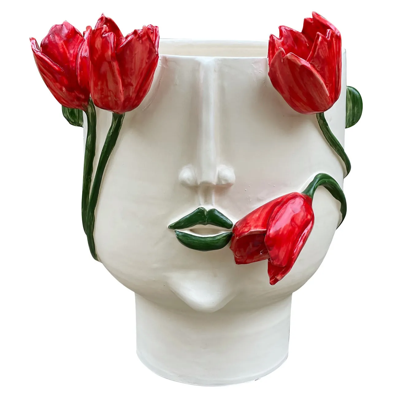 Questo sofisticato vaso in ceramica smaltata bianca sfoggia un aspetto singolarmente accattivante, ispirato all’affascinante donna (“conturbante” in italiano) che si dice difenda questo meraviglioso tulipano della città siciliana di Blufi. I tulipani rossi in fiore, resi in modo squisito e finemente dipinti a mano, avvolgono con grazia la silhouette antropomorfa del vaso, catturando una squisita sintesi di artigianato e natura.