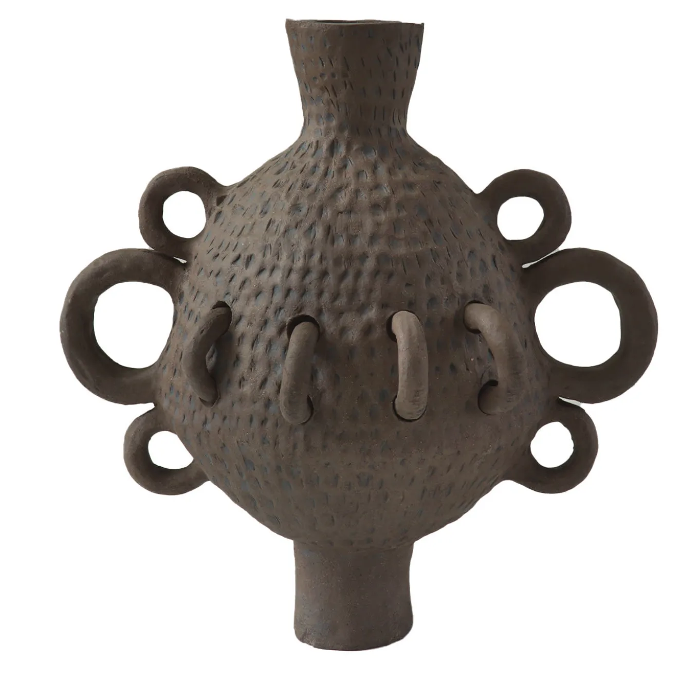 Ispirato alle ceramiche precolombiane, Emprunt appartiene alla collezione “Amuletos”. Le maniglie come anelli, utilizzate nella maggior parte dei rituali tradizionali, sono quasi onnipresenti in questa collezione. L’artista Emilie Lisi ha cercato di evidenziare la consistenza grezza del gres, cotto a bassa temperatura, per ottenere un colore naturale marrone scuro. Questo pezzo fatto a mano, costruito secondo la tecnica dell’arrotolamento, presenta alcune impronte digitali, lasciate di proposito dall’artista come segno. Solo a scopo decorativo, non impermeabile.