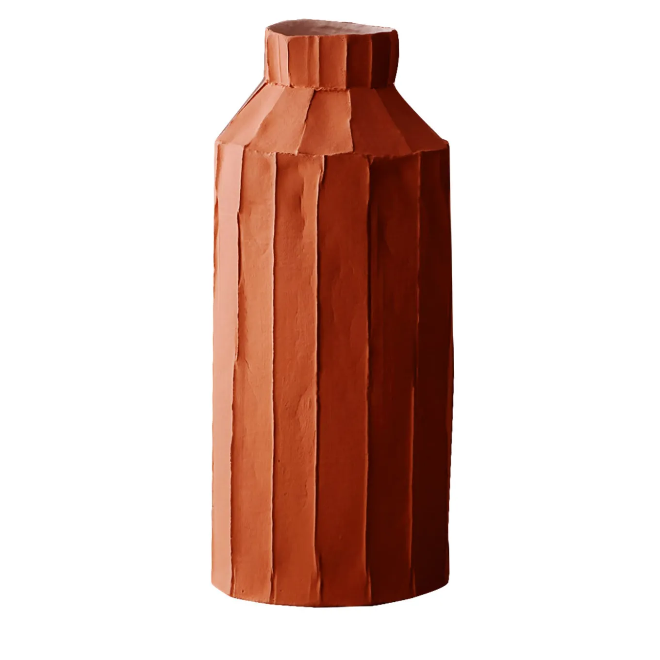 Di colore rosso vivo, questo vaso di grande effetto è caratterizzato da dinamiche creste verticali che ne caratterizzano in modo unico la superficie e che esaltano in modo superbo i bordi irregolari e l’audace texture del pezzo. Questo vaso è stato realizzato a mano in paper clay, un materiale ingegnoso che combina le fibre con la base di argilla per creare oggetti unici di forte valore testuale. Ogni creazione di Paola Paronetto è unica. Lievi variazioni di forma, colore e dimensione sono da considerarsi garanzia di autenticità e valore. Sono rifiniti con smalti satinati atossici. Anche se molto raramente, è possibile che si verifichino perdite dopo una lunga esposizione all’acqua. È quindi consigliabile testarne la resistenza all’acqua prima di utilizzarli su superfici delicate. Non devono essere utilizzati come utensili da pranzo. I pezzi bianchi possono essere lavati con acqua o prodotti igienizzanti, mentre i pezzi colorati devono essere trattati con maggiore delicatezza e puliti con uno spolverino di piume o un panno morbido, asciutto o inumidito molto leggermente con acqua.