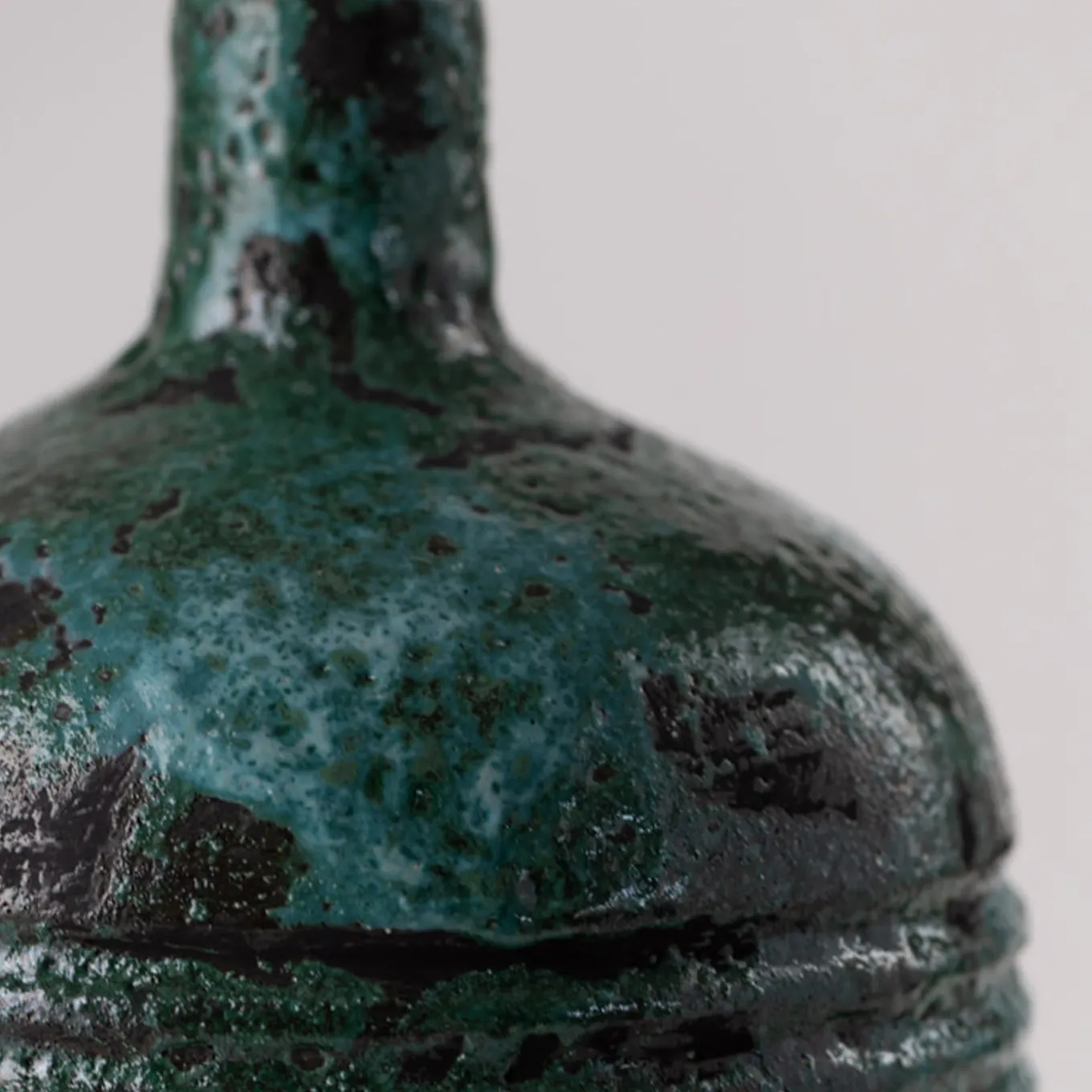 Ispirato agli antichi vasi e ai disegni originali di Ceramiche Bagni, questo splendido oggetto d’arte è un vaso in ceramica magistralmente realizzato a mano secondo i metodi tradizionali della lavorazione della ceramica. Caratterizzato da una silhouette ampia e capiente con un collo stretto, è squisitamente decorato con uno smalto ipnotico dai toni verdi e neri impreziosito da una finitura semi-opaca e arricchito da scanalature orizzontali.