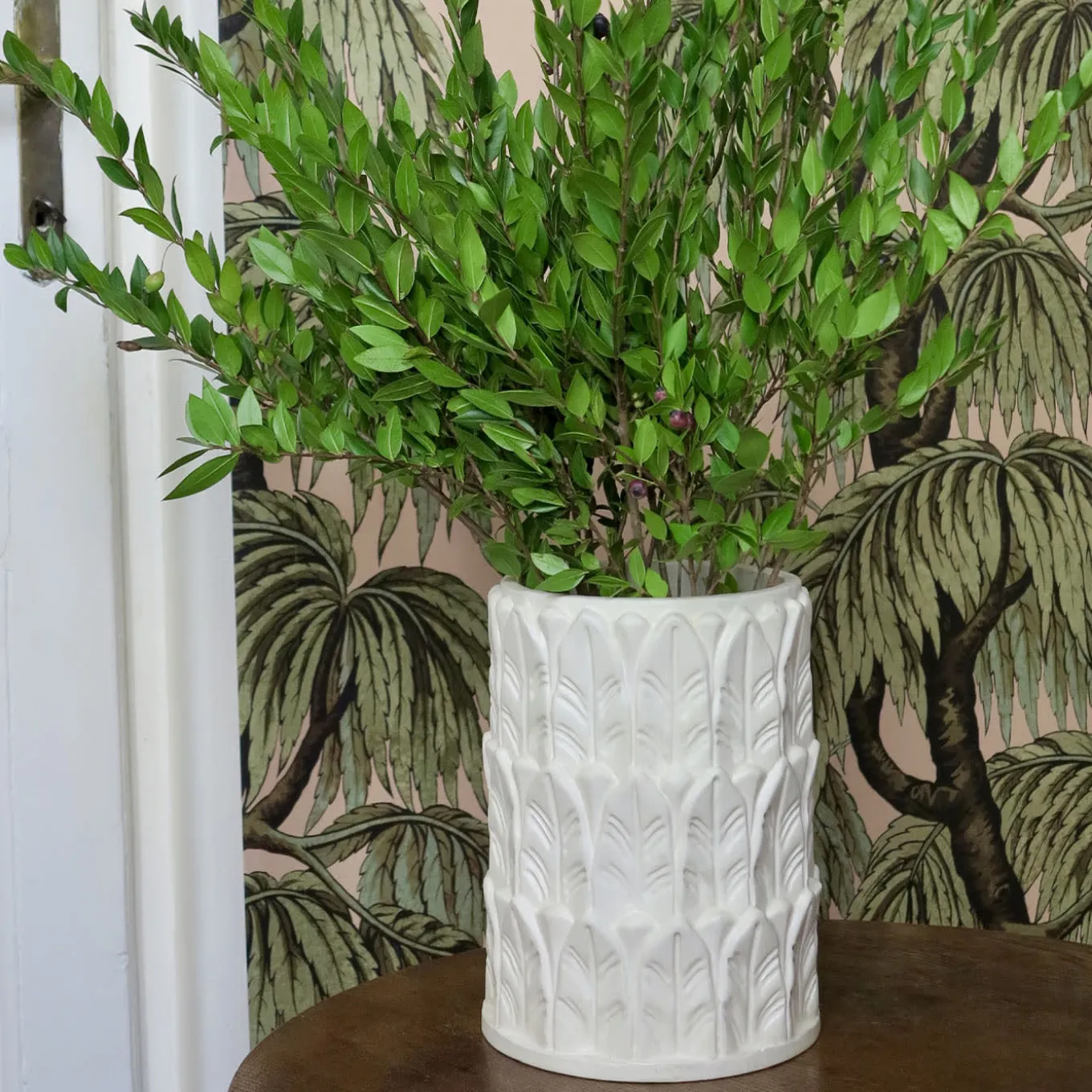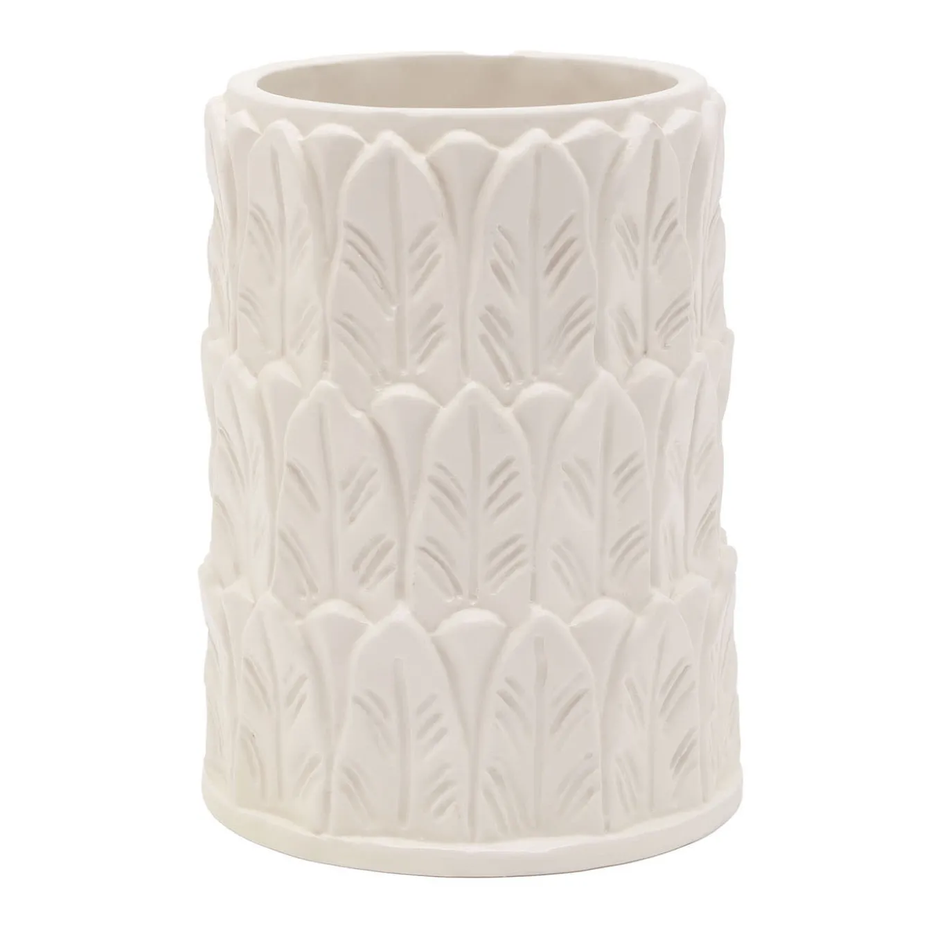 Riprendendo il motivo decorativo delle iconiche colonne di Pietrachiara, questo vaso della serie Anne si distingue per l’impeccabile luminosità del corpo in gres total white e per i dettagli materici del motivo a foglie in rilievo. Il fascio floreale destinato a essere inserito nel vaso completerà la composizione idealmente concepita come una piccola colonna cilindrica ricoperta di fronde e sormontata da fiori colorati. Lo strato di cristallina all’interno lo rende impermeabile.