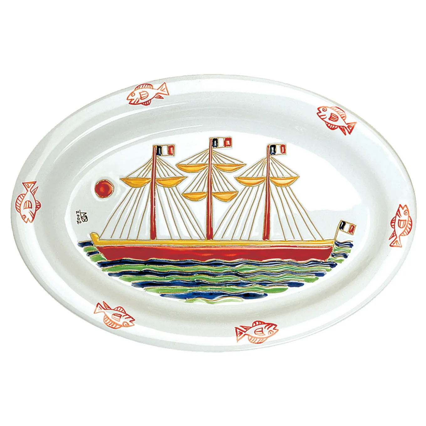 Una squisita celebrazione della vita marina sarda, questo sorprendente vassoio ovale è interamente realizzato a mano in ceramica pregiata e vanta una decorazione fatta a mano con la tecnica del graffito, in cui i colori vengono incorporati nella ceramica graffiando la superficie. Un design di Mario De Biasi, che infonderà raffinatezza in qualsiasi arredamento.