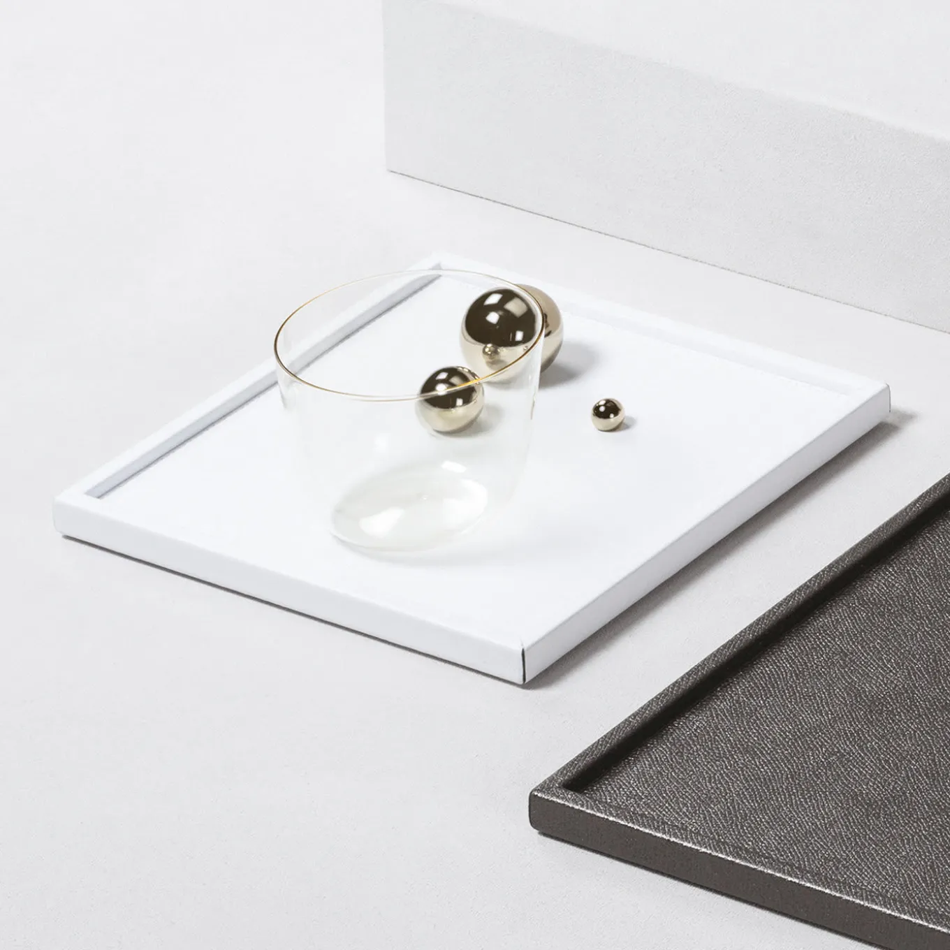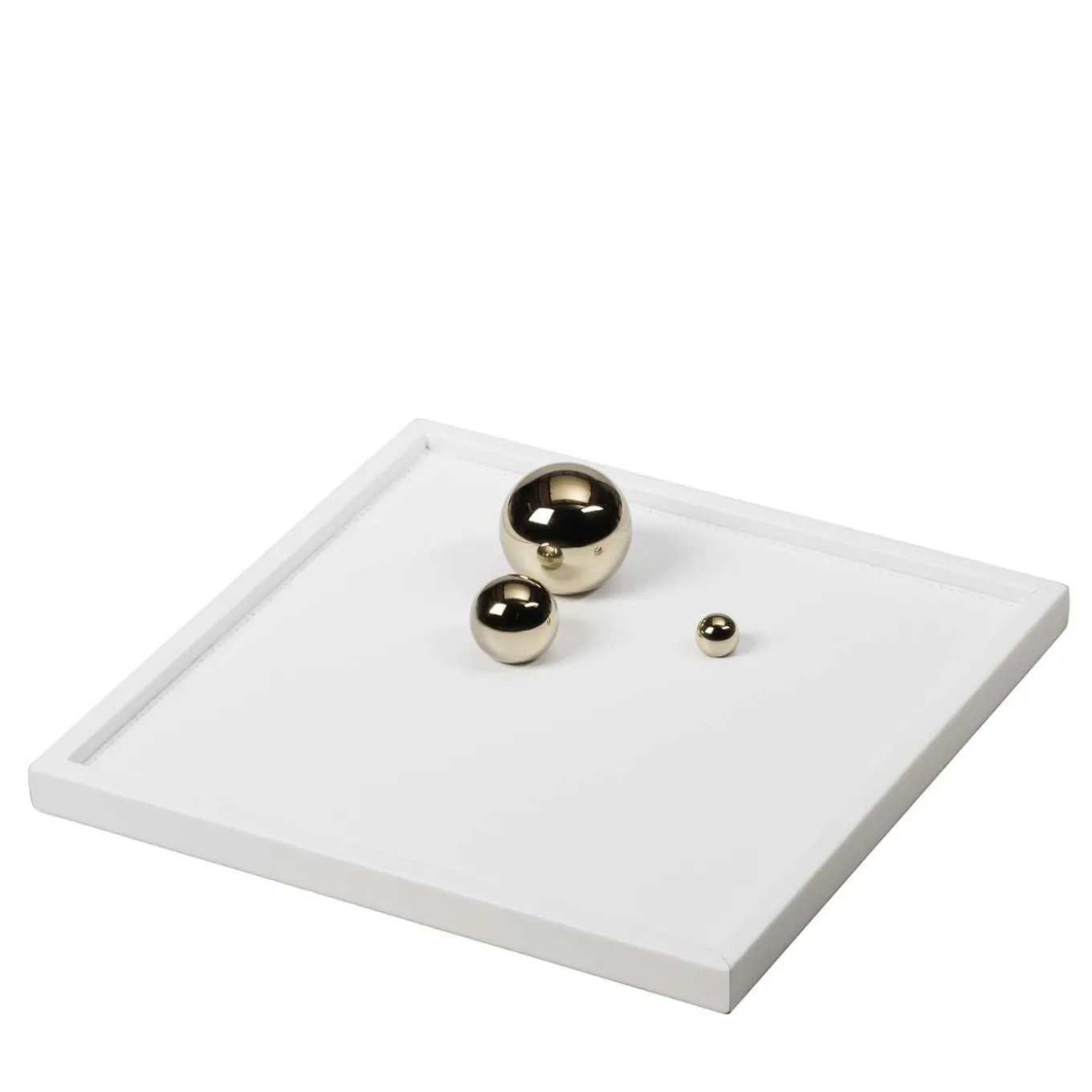 Un magnifico design contemporaneo che soddisferà qualsiasi esigenza estetica d’interni, questo vassoio è un utile complemento d’arredo funzionale da usare come vide-poche vicino all’ingresso per raccogliere chiavi e monete, o per servire bevande, o da esporre come elegante accessorio su un tavolino. Resistente ai graffi e all’acqua, ha una struttura in legno rivestita in pelle con tre sfere in resina con finitura oro lucido. La pelle è disponibile in oltre 200 colori e texture.