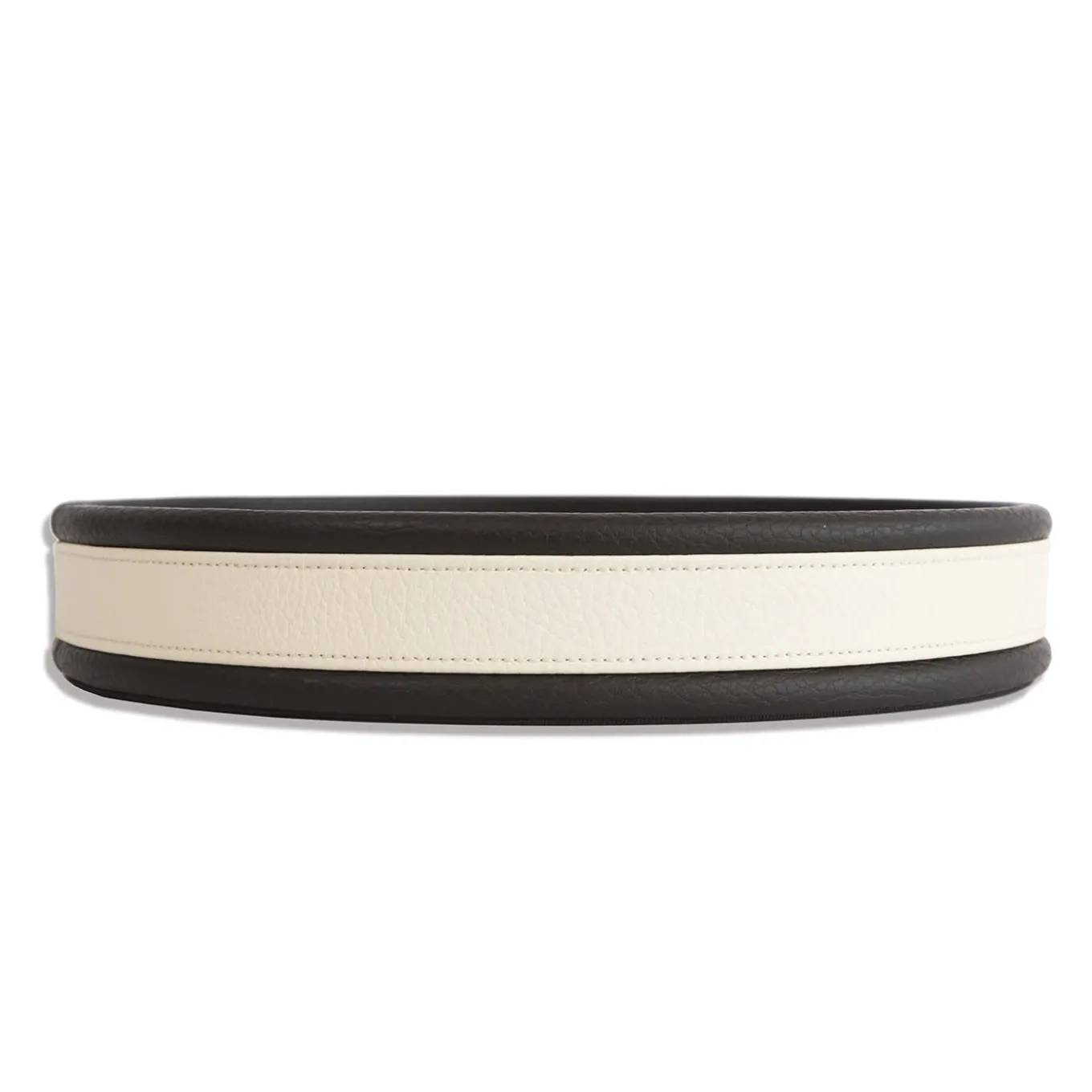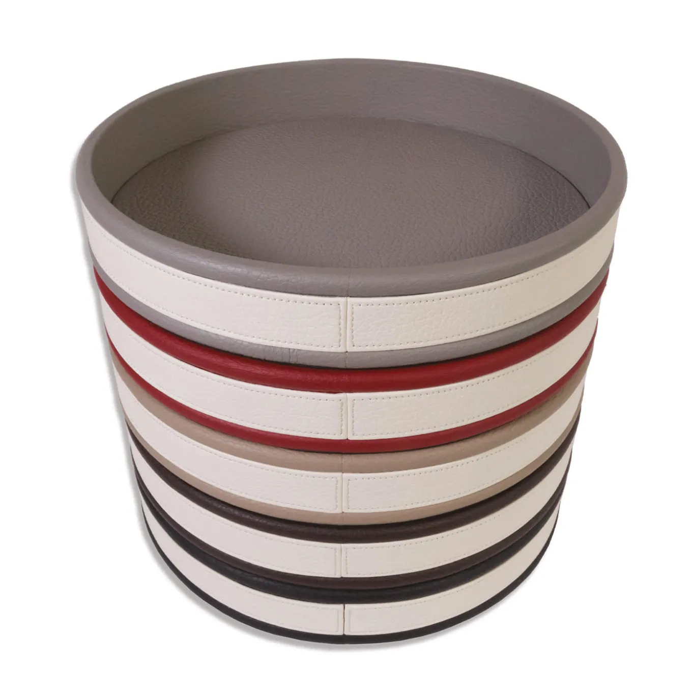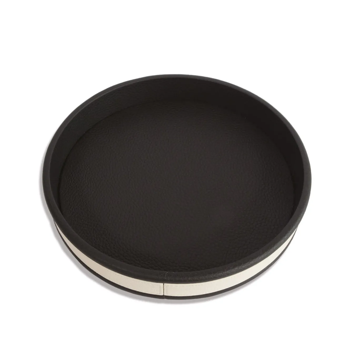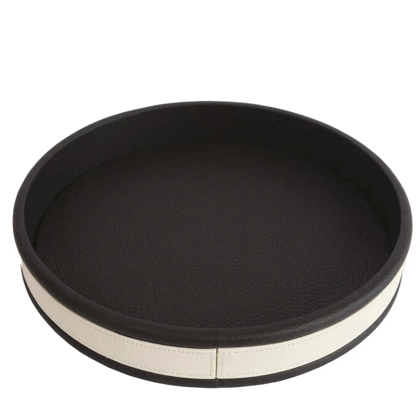 Elegante e versatile nella sua forma pulita e nella squisita combinazione di colori, questo vassoio rotondo è abilmente realizzato a mano in morbida e autentica pelle pieno fiore con cuciture tono su tono. Nero e bianco, è disponibile in sei diverse combinazioni di colori; per maggiori dettagli, consultare il catalogo Artemest.