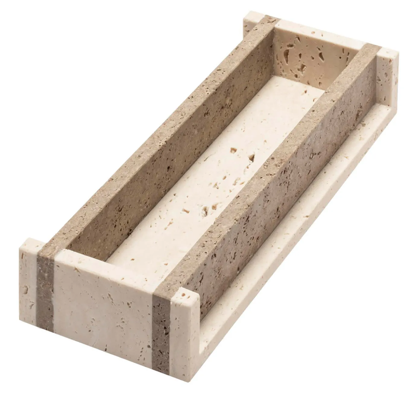 Con i suoi volumi monolitici e puramente geometrici, questa collezione per l’ufficio è caratterizzata da dettagli grafici nati dall’accostamento di due nuance di travertino, che creano un caratteristico contrasto visivo con l’aspetto materico e poroso di tale marmo. Design di Simone Fanciullacci.
