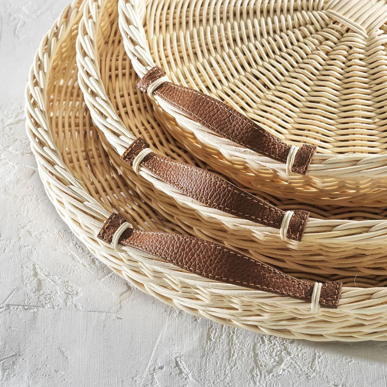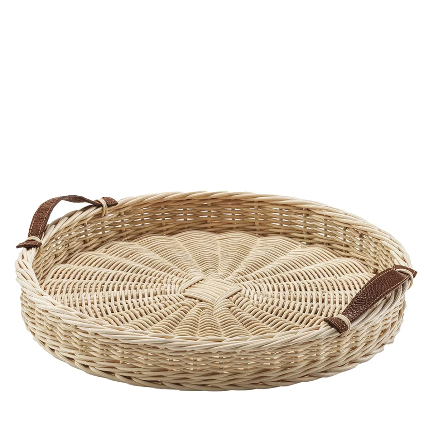 Questo singolare vassoio rotondo, realizzato intrecciando a mano canne in un intricato disegno di vimini, unisce l’antica maestria artigianale a un fresco minimalismo. Dotato di manici in pelle marrone, presenta un disco di vetro trasparente appoggiato sul fondo per una stabilità eccezionale nel servire le bevande. Una speciale finitura a base d’acqua gli permette di resistere alla prova del tempo. Sono disponibili anche varianti di Ø 32 x H 5 cm e Ø 38 x H 5 cm.