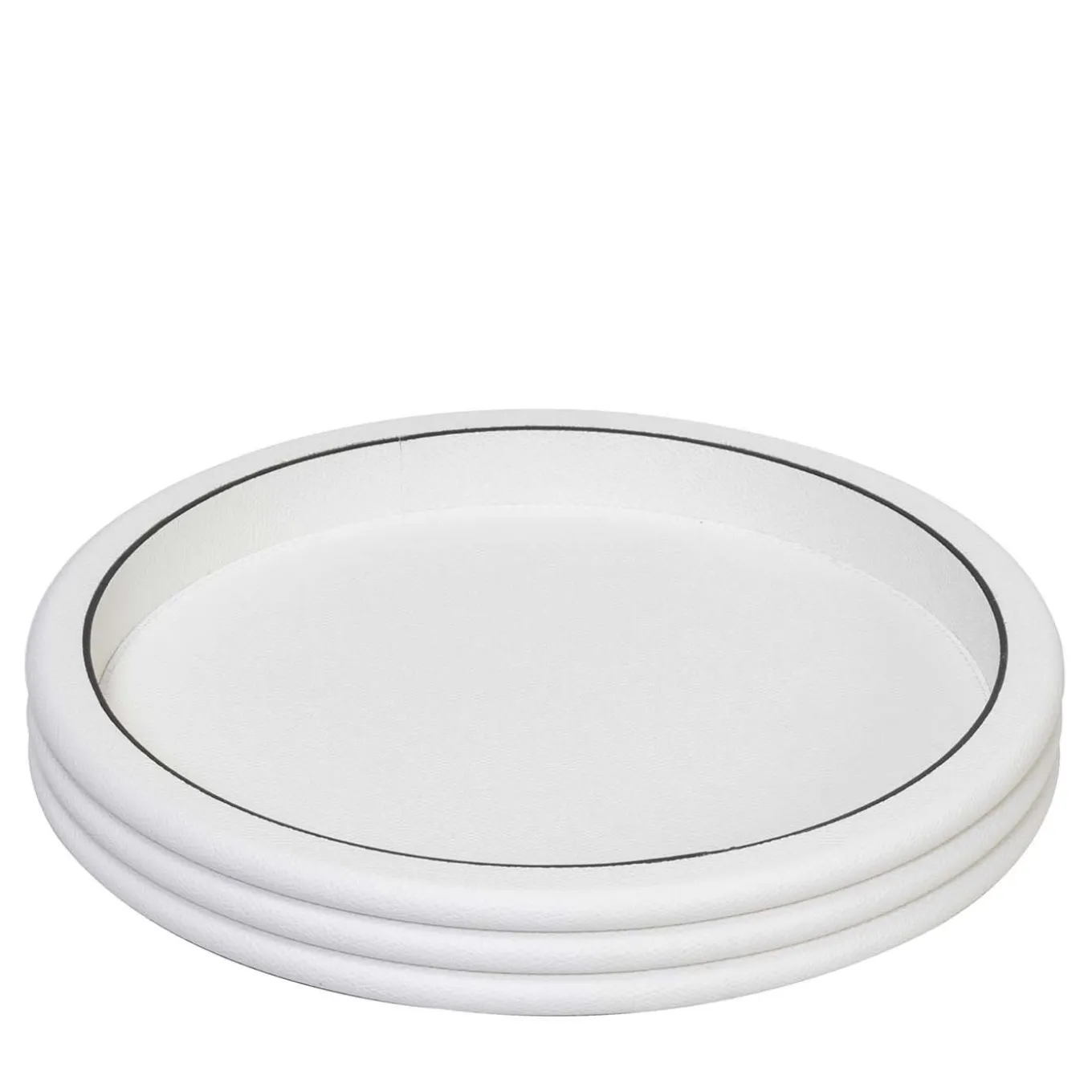 Celebrazione dell’architettura e della moda italiana, questo vassoio riproduce il profilo sovrapposto del famoso tacco di Salvatore Ferragamo e quello di alcuni edifici italiani. La sua silhouette rotonda è composta da tre strati profondi di legno rivestiti in pelle bianca e arricchiti da un raffinato bordo nero.