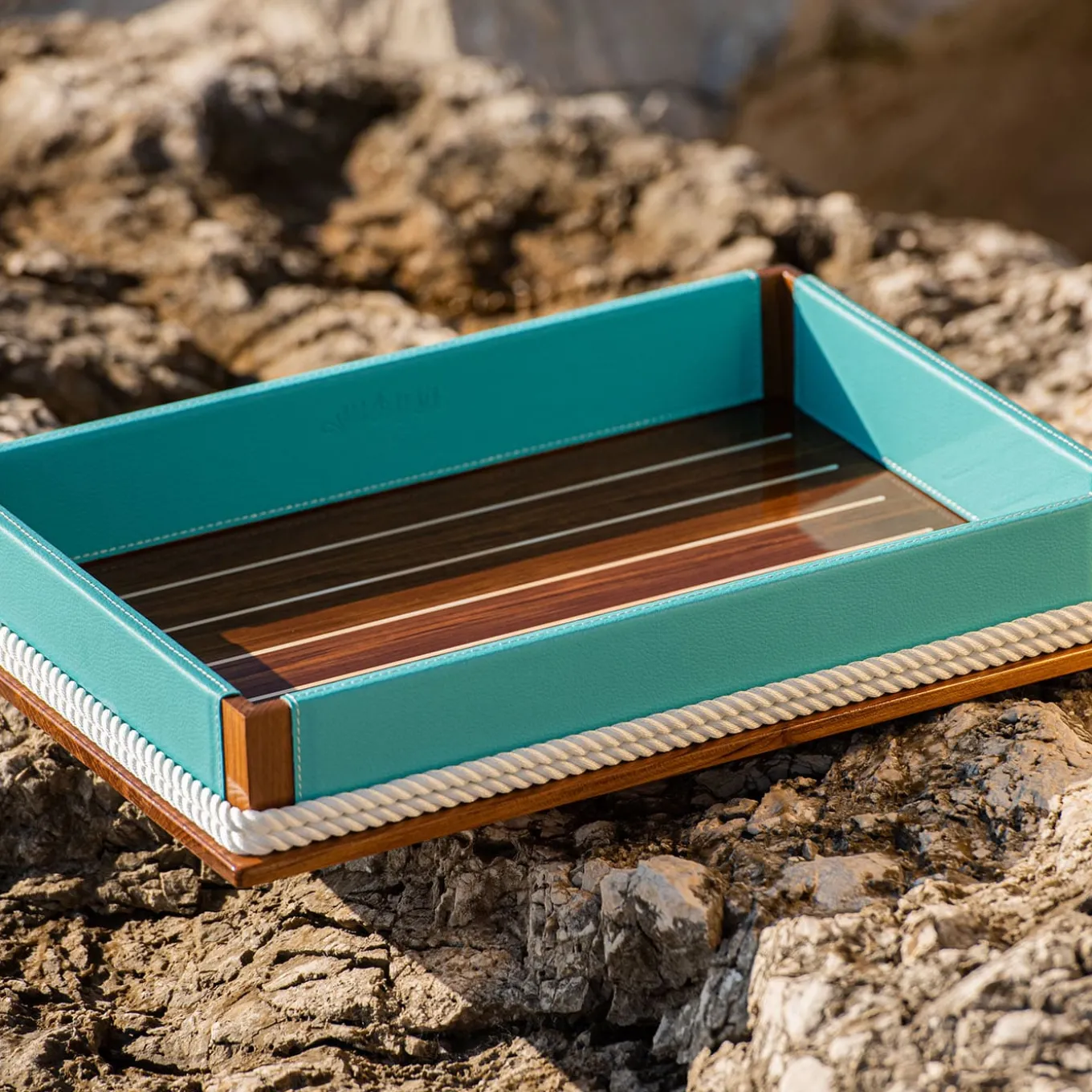 Arricchito da linee rette che ricordano i ponti delle barche, questo robusto vassoio in legno è la soluzione perfetta per servire un aperitivo o un tè da gustare respirando la brezza marina. La sua silhouette è caratterizzata da corde bianche di ispirazione nautica, che si aggiungono agli accenti in ecopelle azzurra che ricoprono i lati per facilitare la presa e dare un tocco di freschezza cromatica.